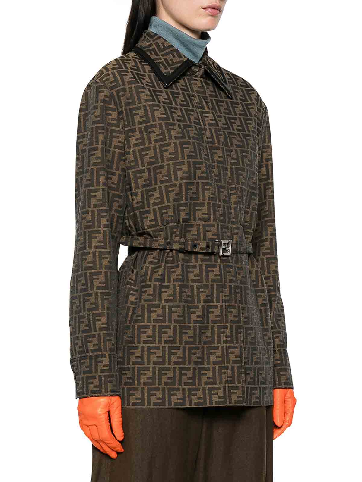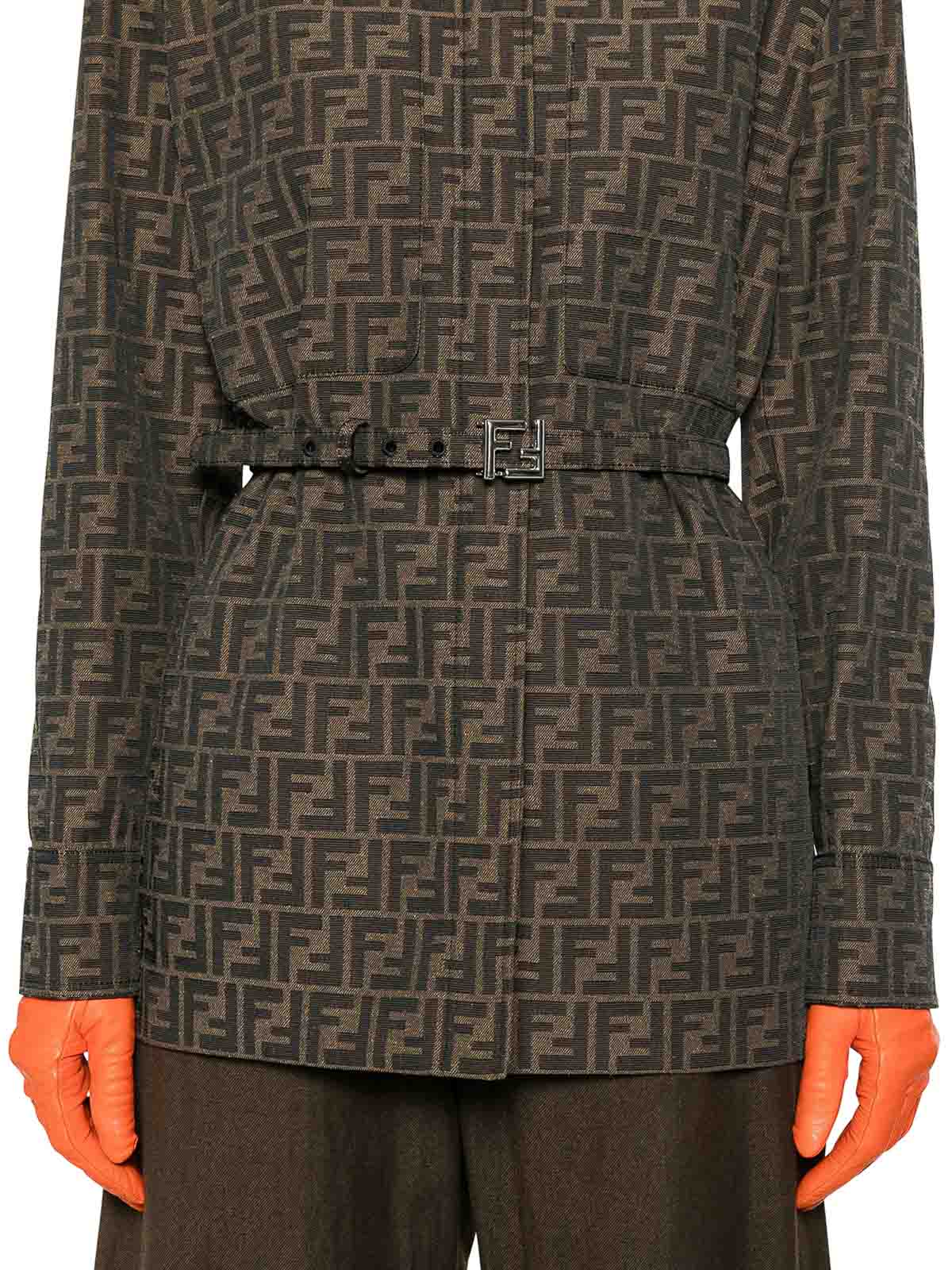 ff motif, concealed front button placket, spread collar, long sleeves, buttoned cuffs, patch chest pocket, removable belt, two side pockets, side slits, asymmetrical hem, color: tobacco