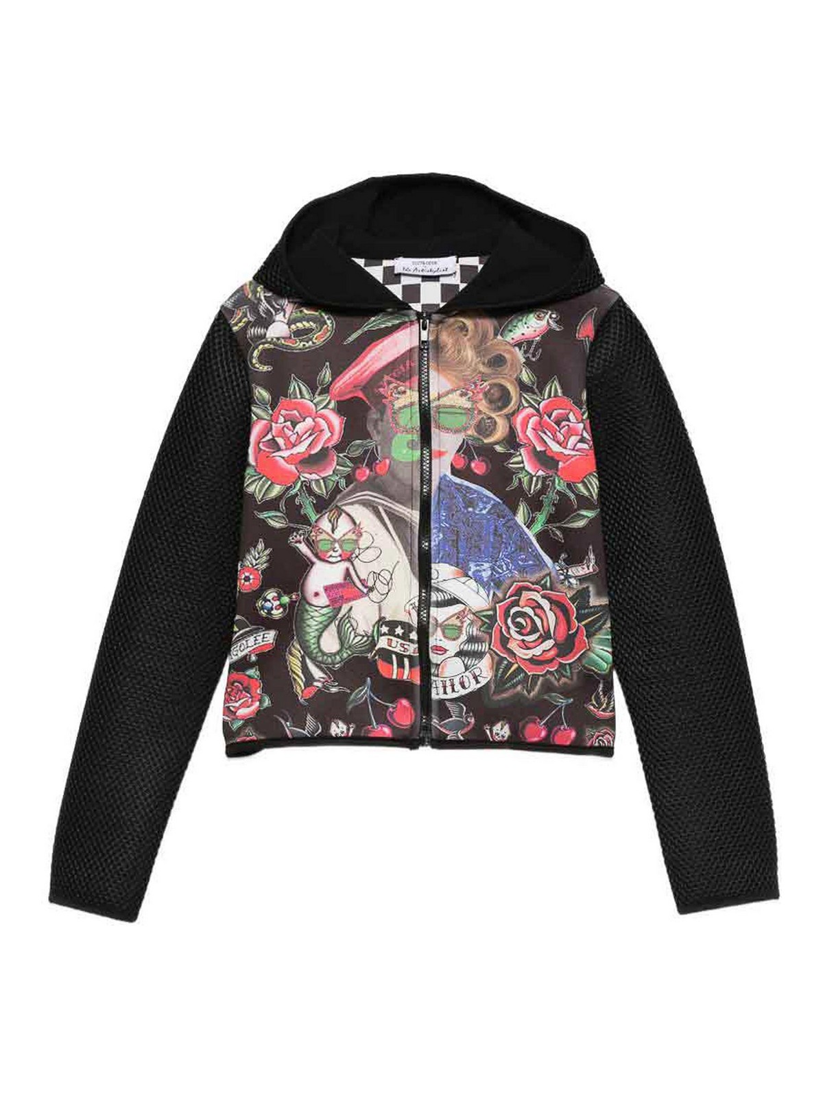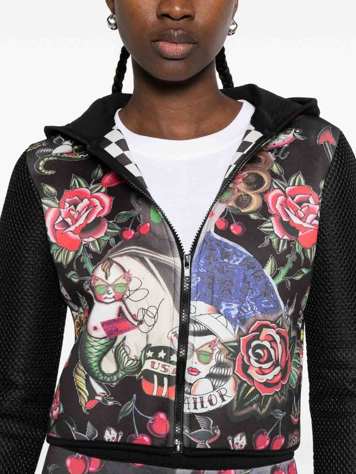 Black, multicoloured floral print zip fastening hood long sleeves