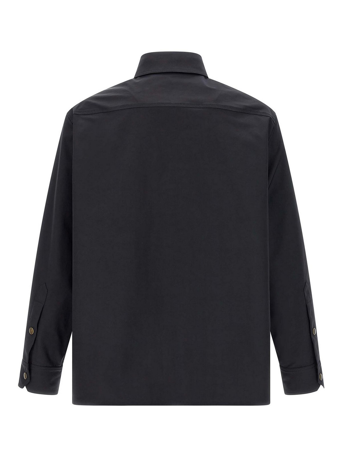 Shirt-style nylon jacket with pocket with rubberized 'v detail' patch, snap button closure, long cuffed sleeves.