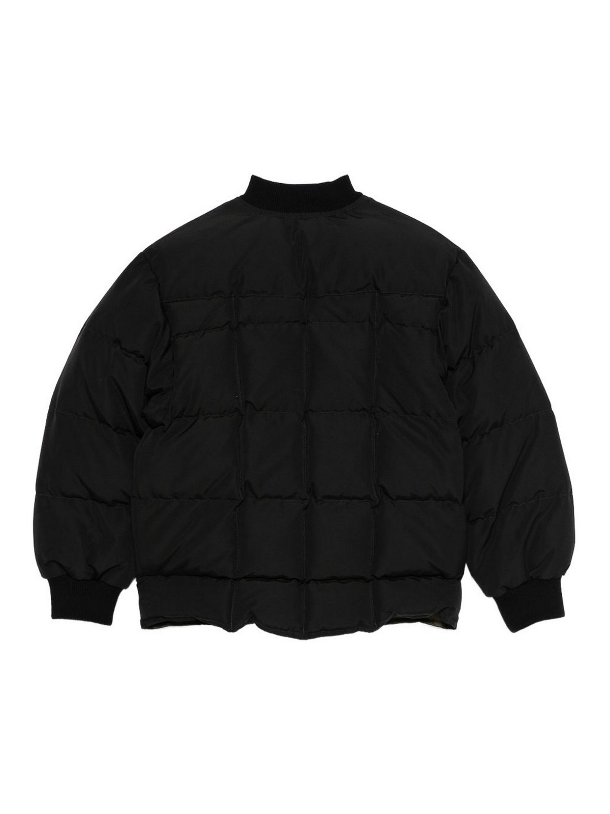 Quilted bomber jacket, black zip closure, ribbed elbows, printed logo, puff pockets