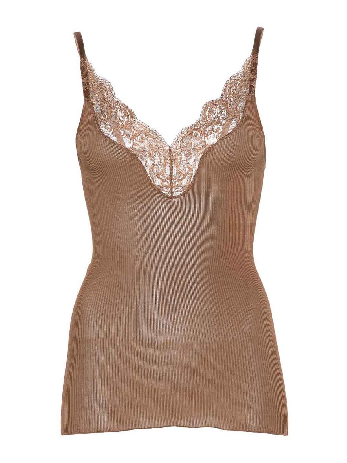 Brown ribbed knit lace panel v-neck spaghetti straps adjustable straps