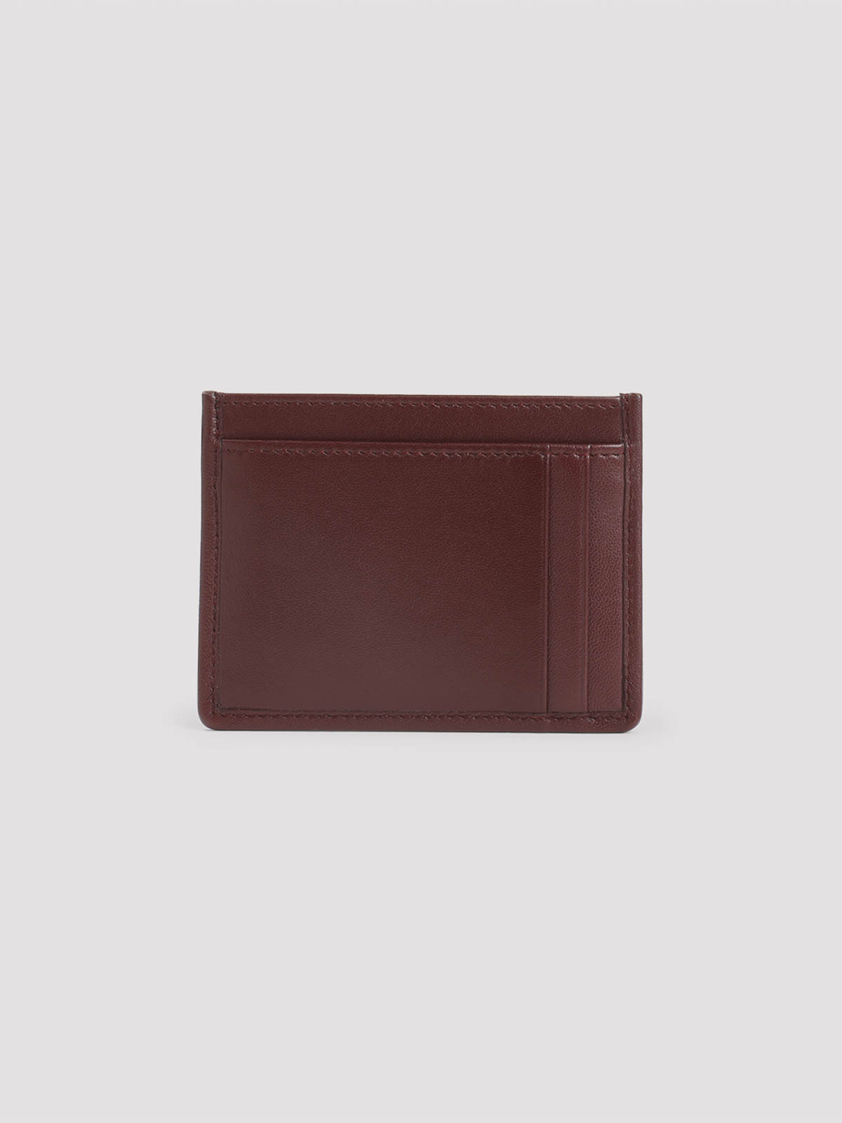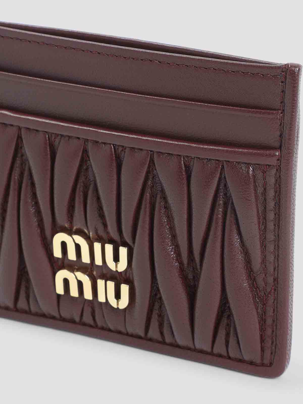 Miu miu bordeaux lamb leather cardholder. crafted from bordeaux lamb leather, tonal matelass leather insert, golden-toned metal logo on the front. two front card slots and three on the back.