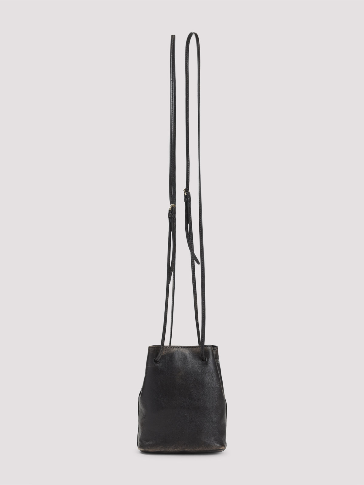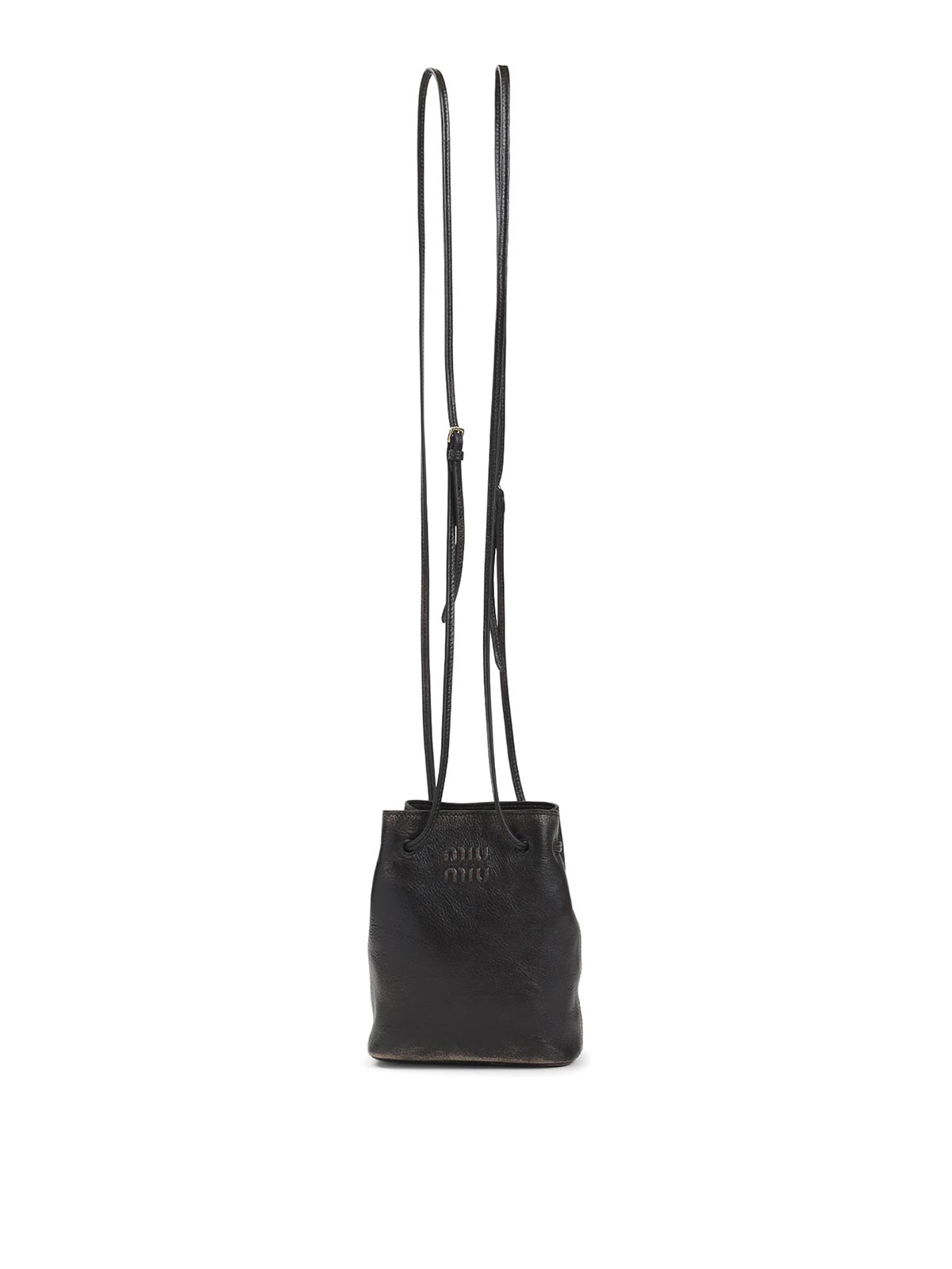 Miu miu lamb leather pouch. crafted from brown lamb leather with a vintage effect, featuring a logo patch on the front, two adjustable shoulder straps with buckles, and one inner pocket.