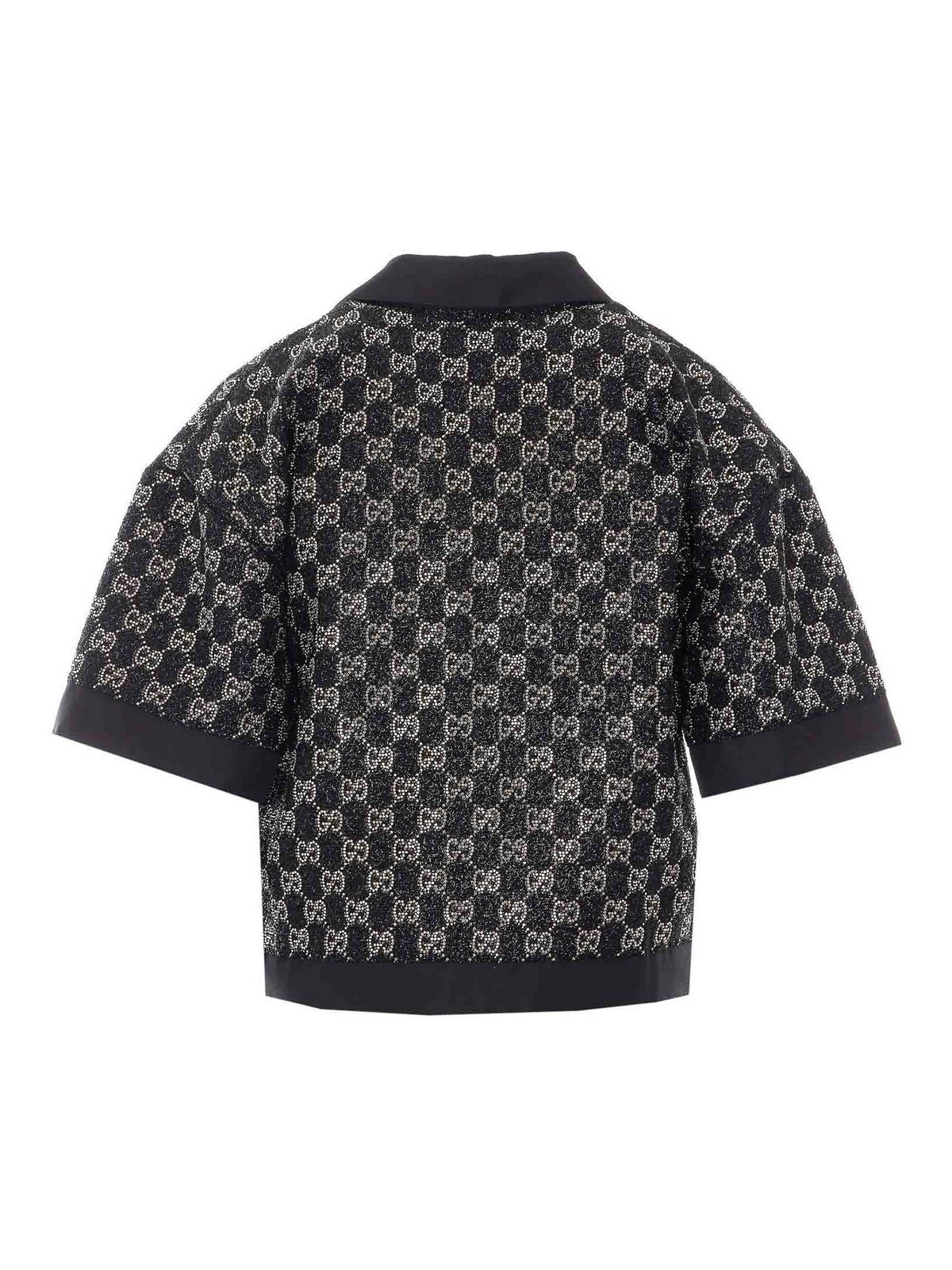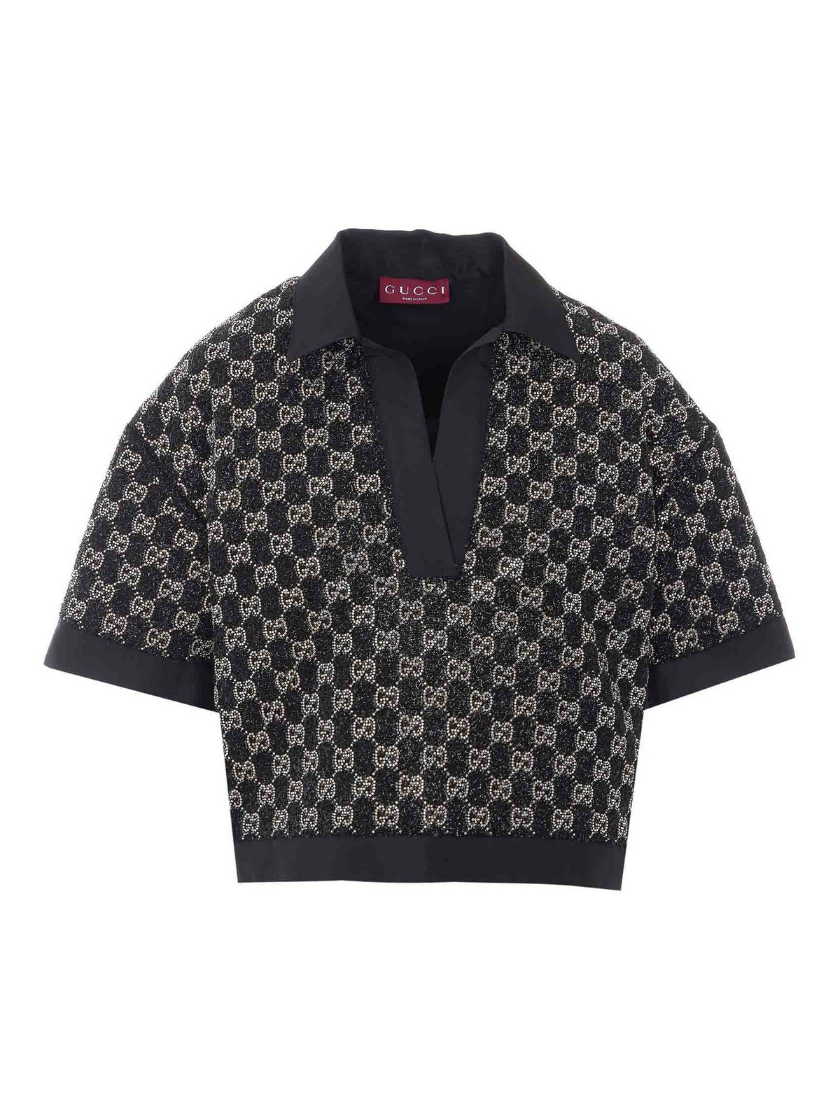 Gucci black top, all over gg logo strass details, regular collar, short slevees