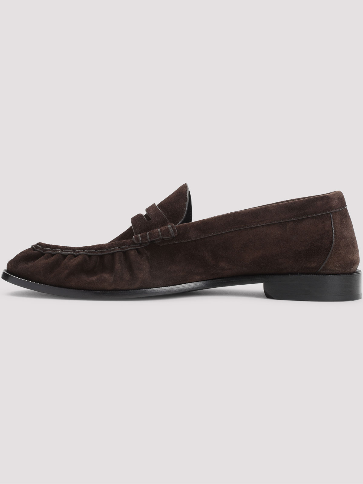 Saint laurent le brown suede leather loafers. vamp crafted from brown suede leather, almond toe, penny strap with gold-toned metal cassandre logo detail, front piping and tonal stitching, leather lining, insole and outsole.