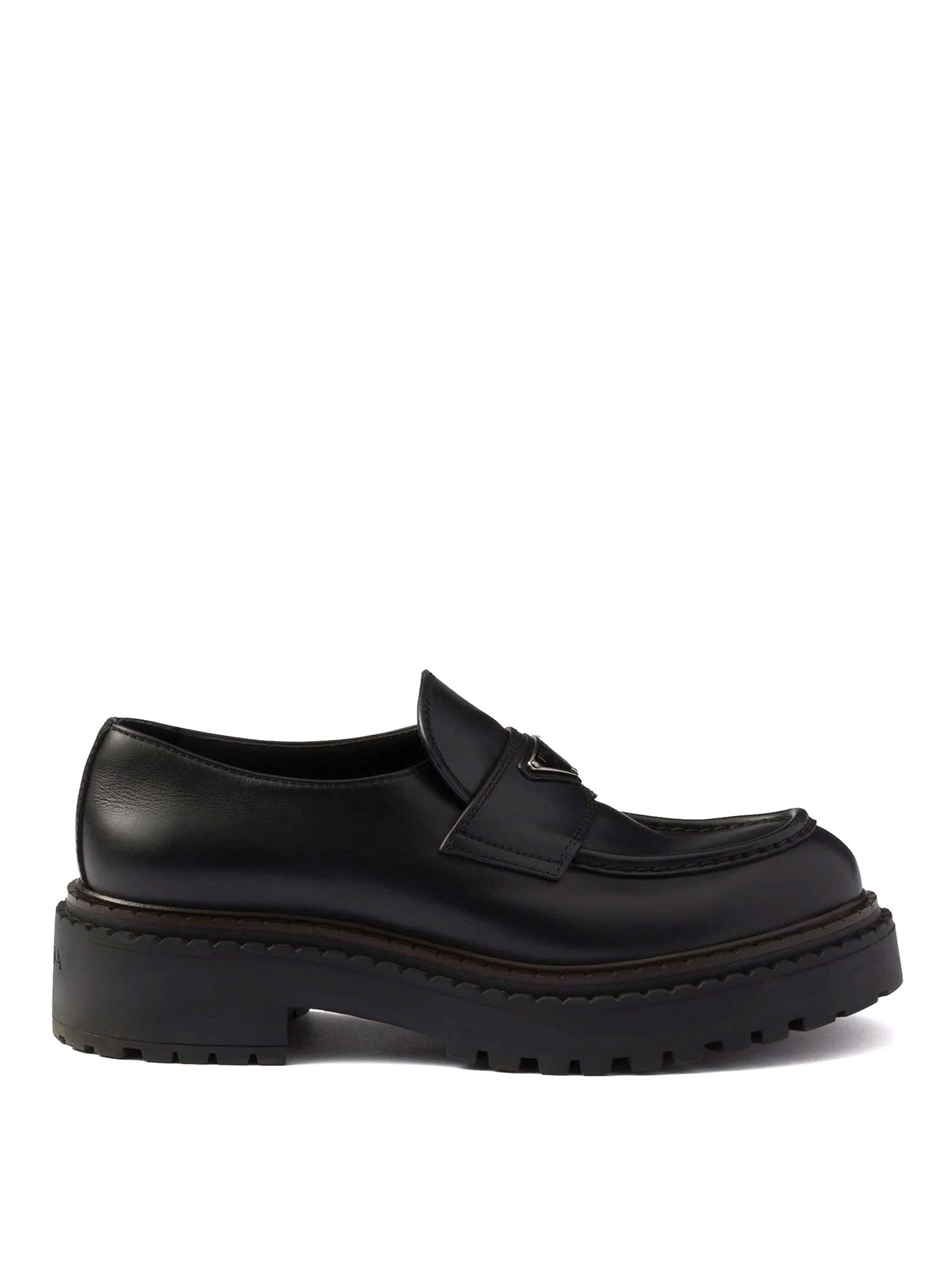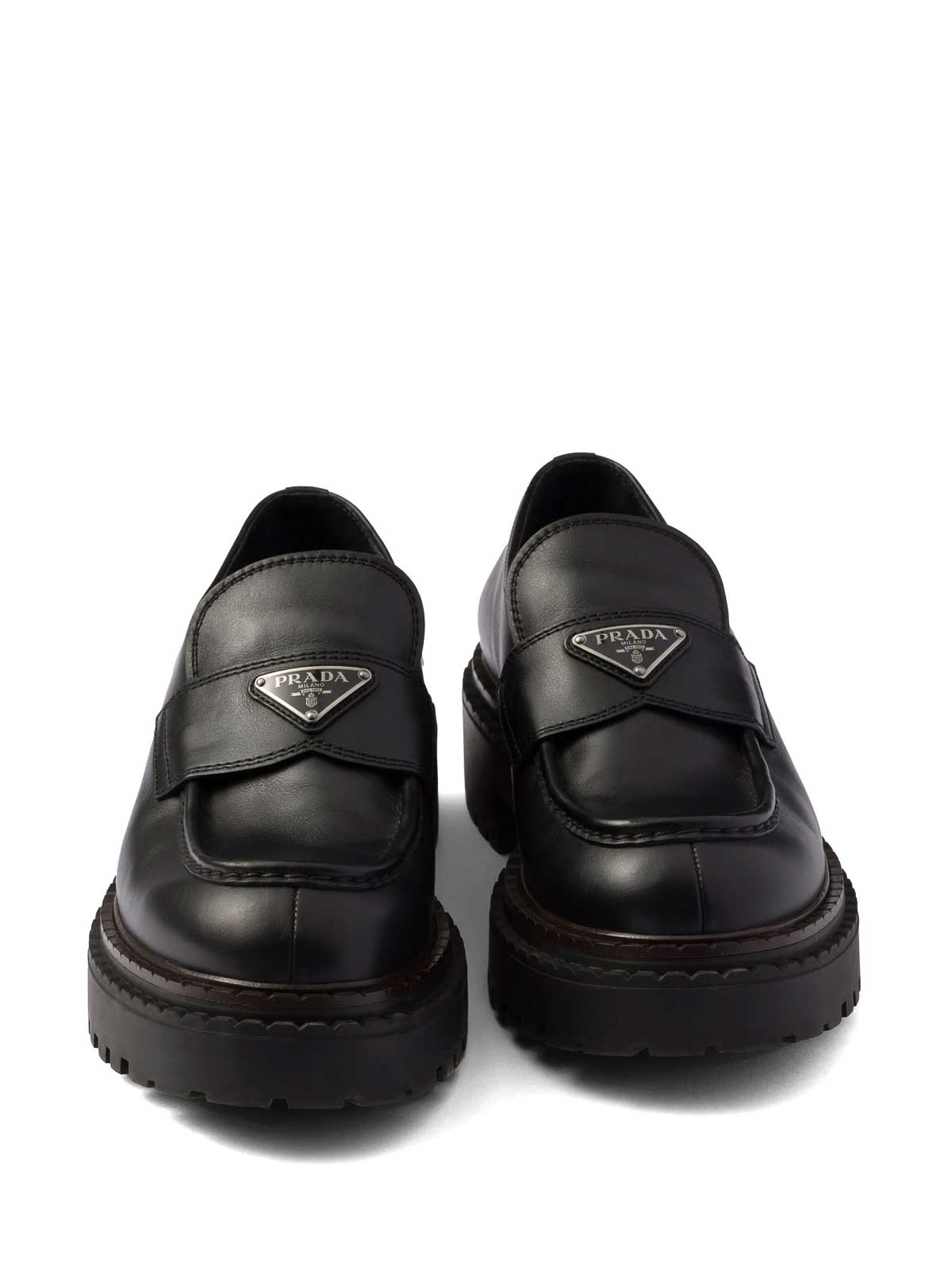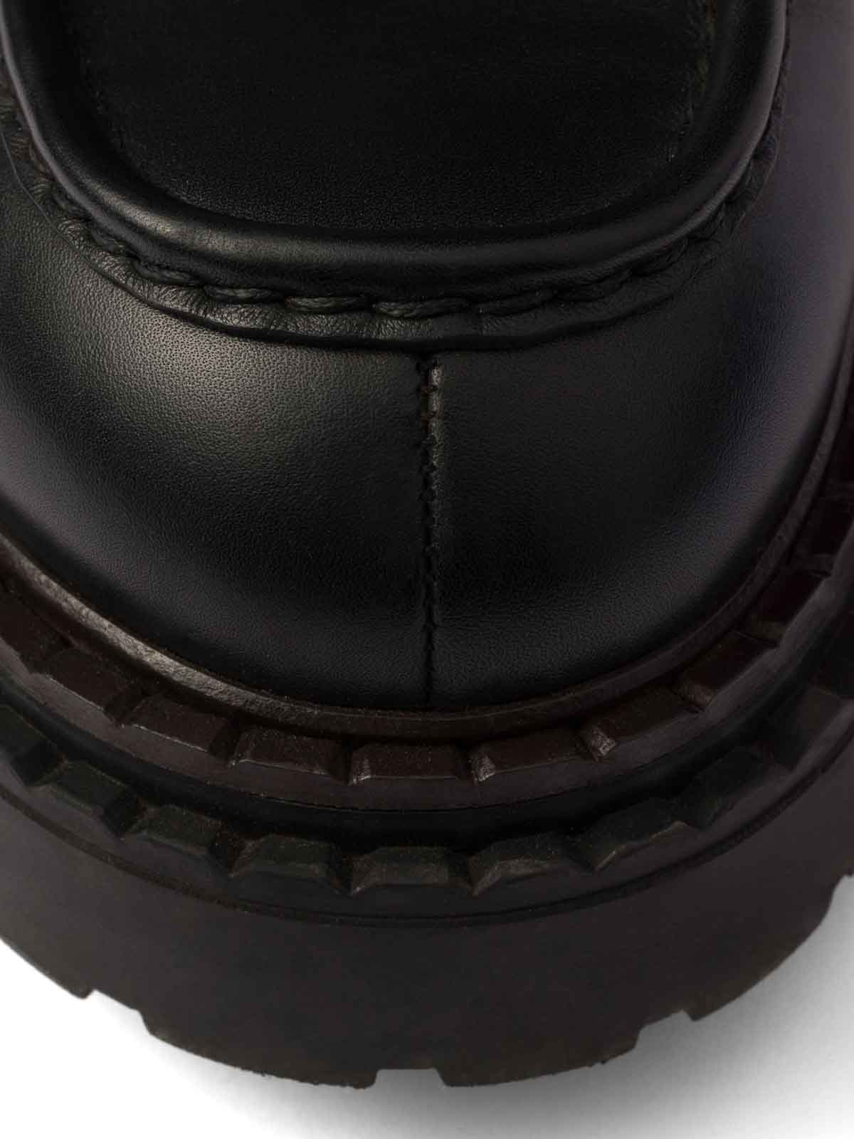 black smooth grain triangle logo moc stitching almond toe branded in chunky slip, on style this piece comes complete with a protective dust bag