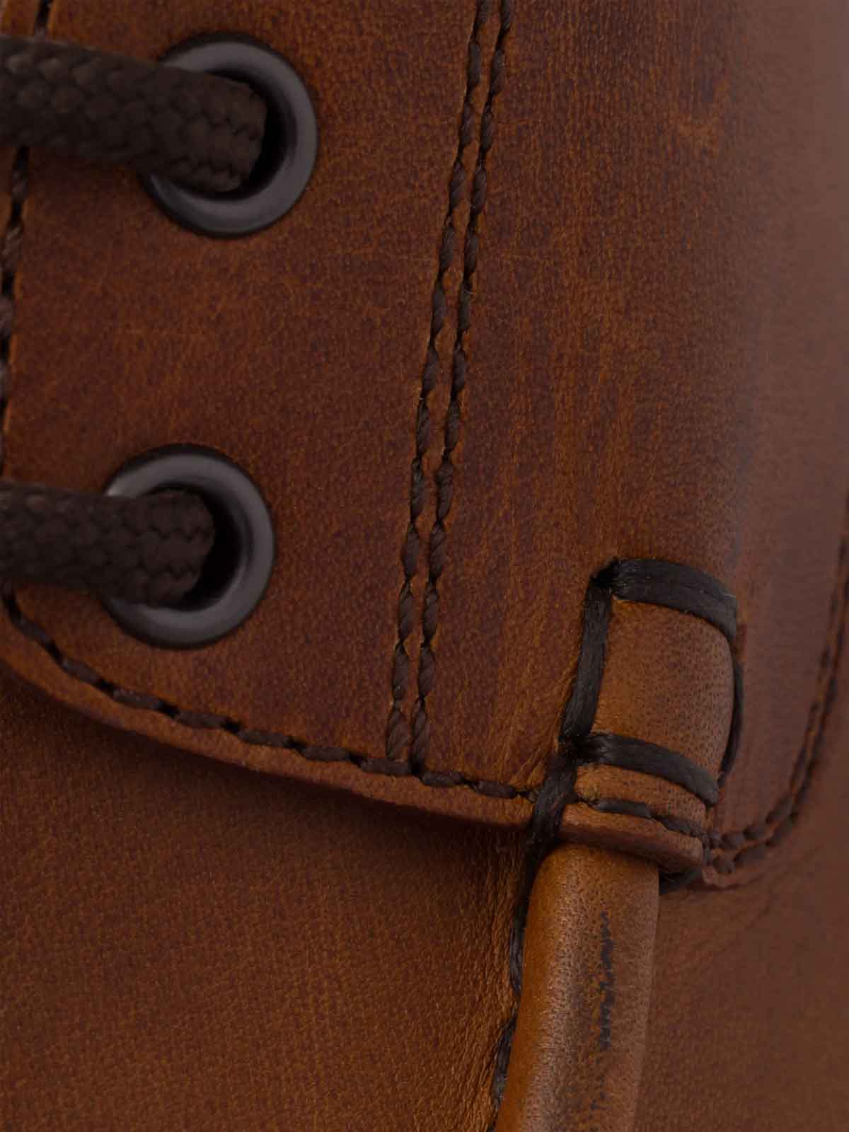 Caramel brown smooth grain lace, up low block piped, trim detailing logo, debossed tongue round toe branded in chunky