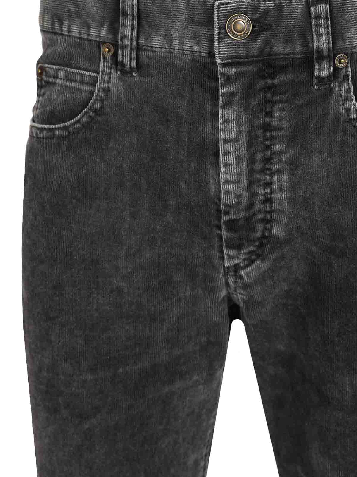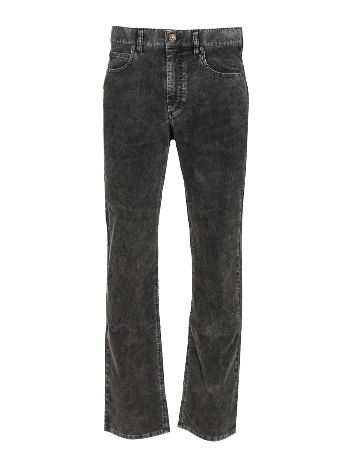lewys trousers in raw denim by marant, featuring a fixed waistband with belt loops, a metal button and covered zip fastening, 5 classic pockets, a leather label with an embossed isabel marant logo on the back, metal studs, silver-tone metal hardware and a regular waist.