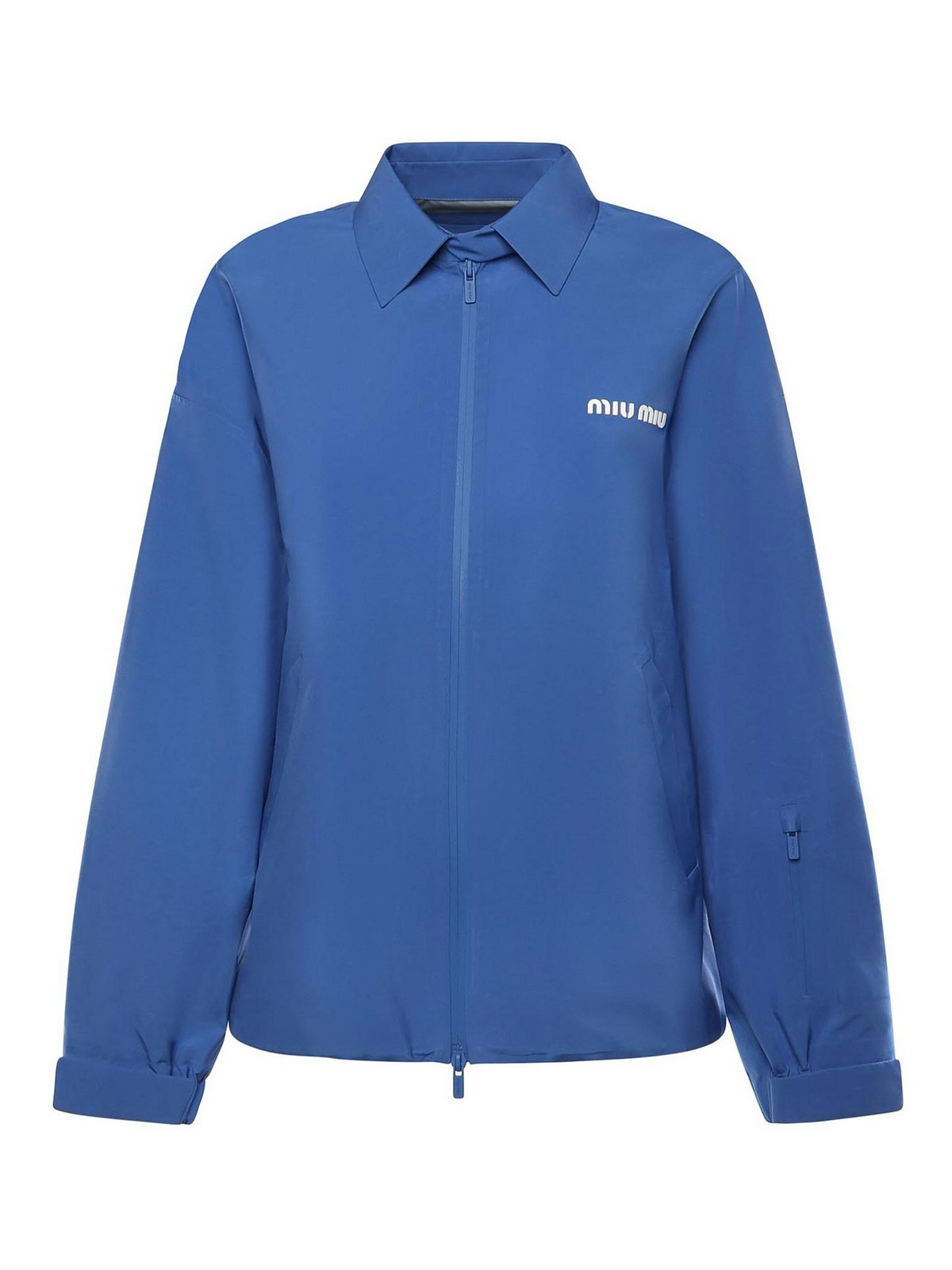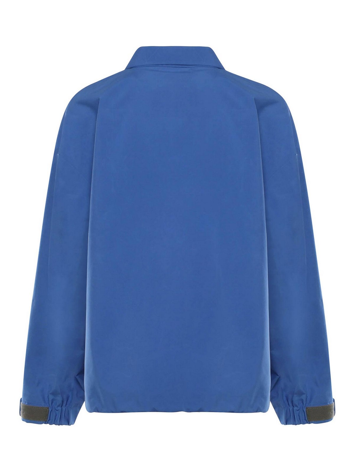 front zip closure, shirt collar, long sleeves, contrasting logo lettering,