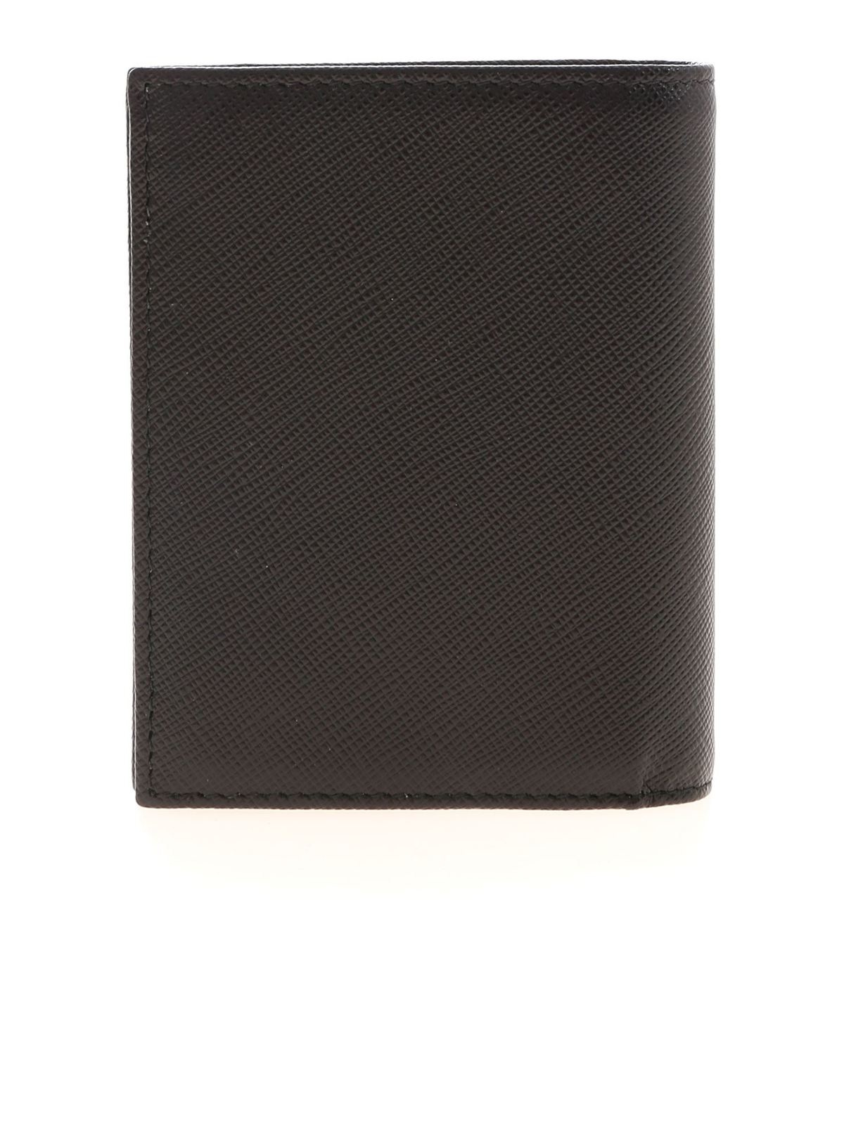 Saffiano leather wallet Color: black Logo detail Banknote pockets Inner slot pocket 4 card slots Coin purse with snap button Golden metal details Snap button fastening