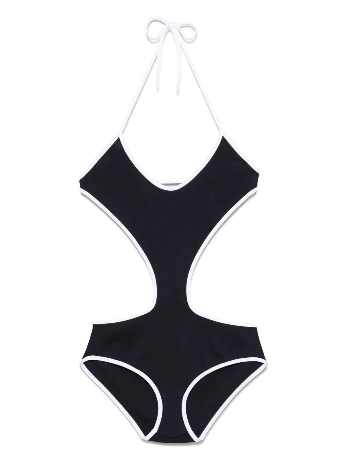 Navy blue halterneck tie contrasting trim cut-out detailing be mindful to try on swimwr over your own garments