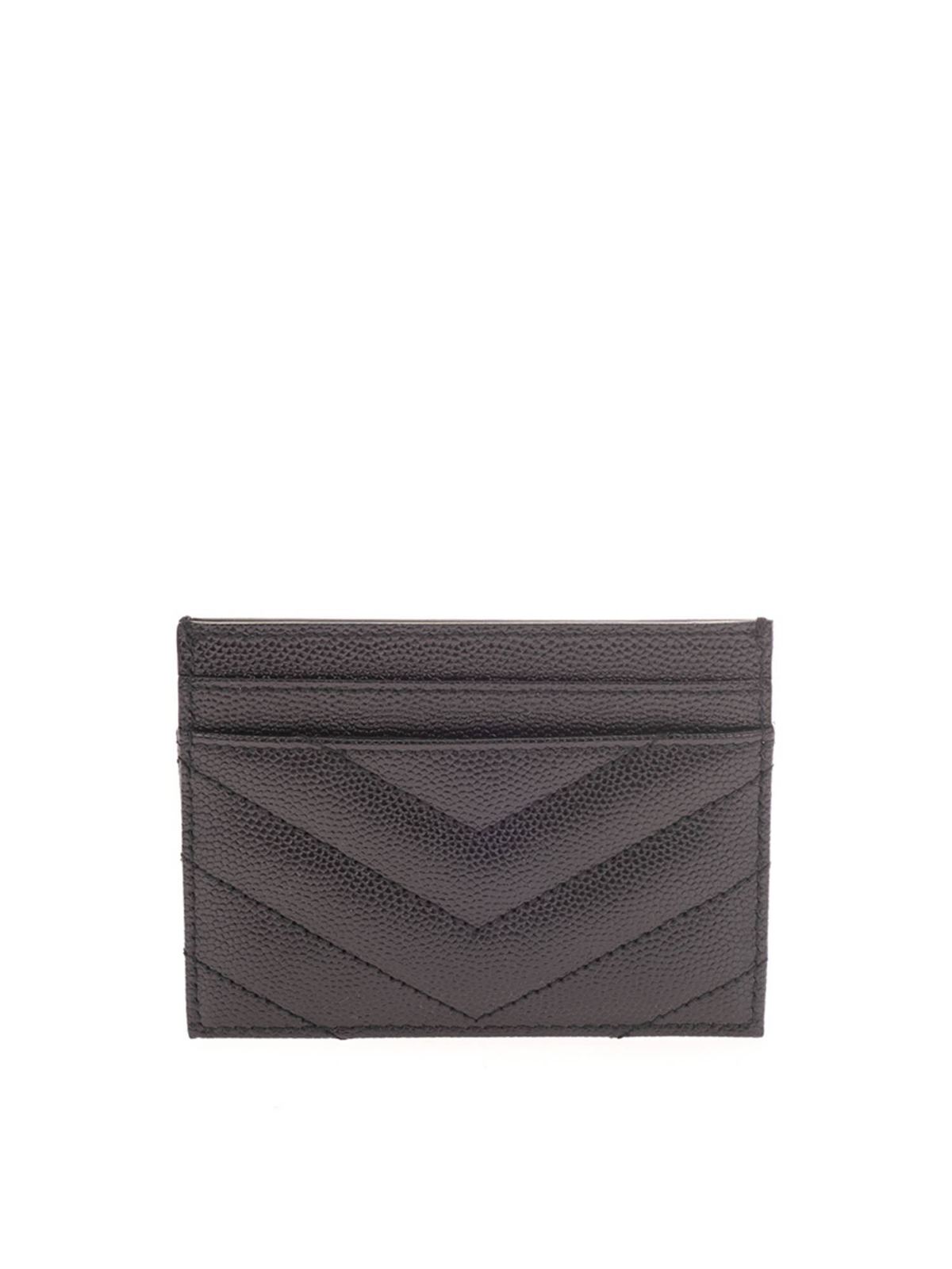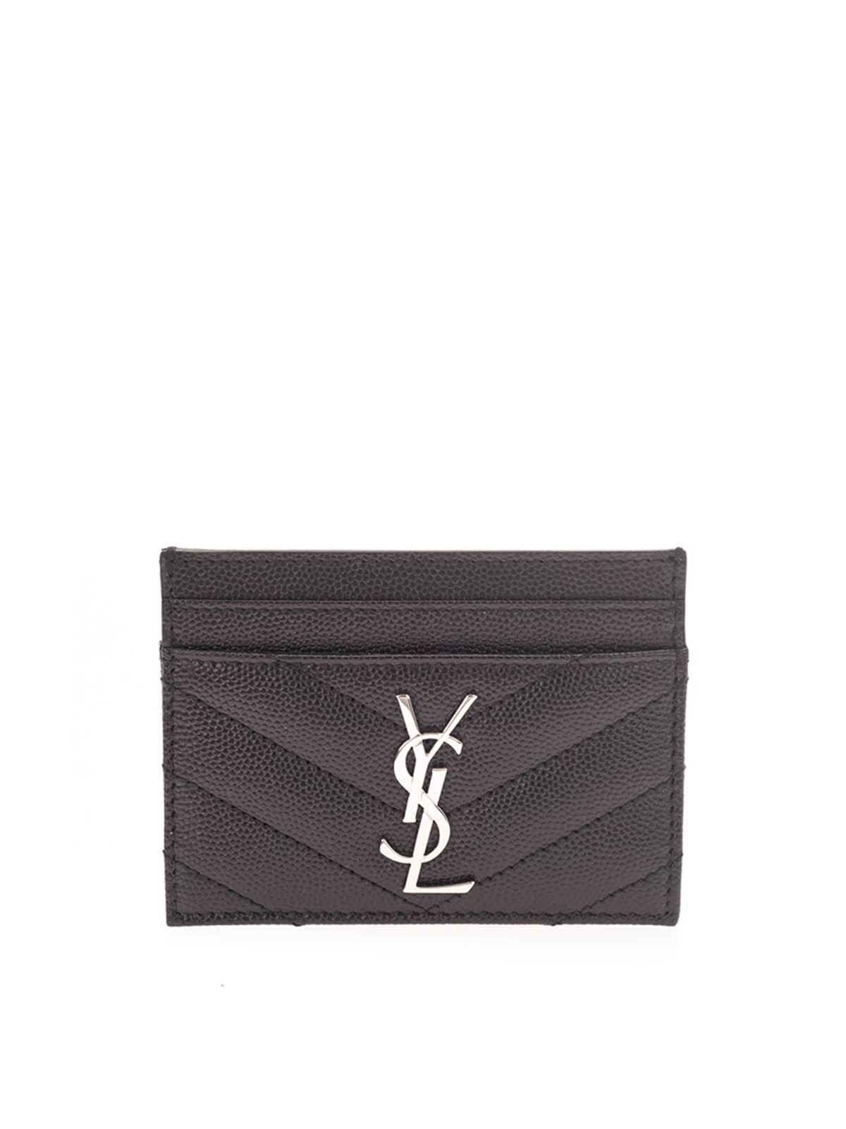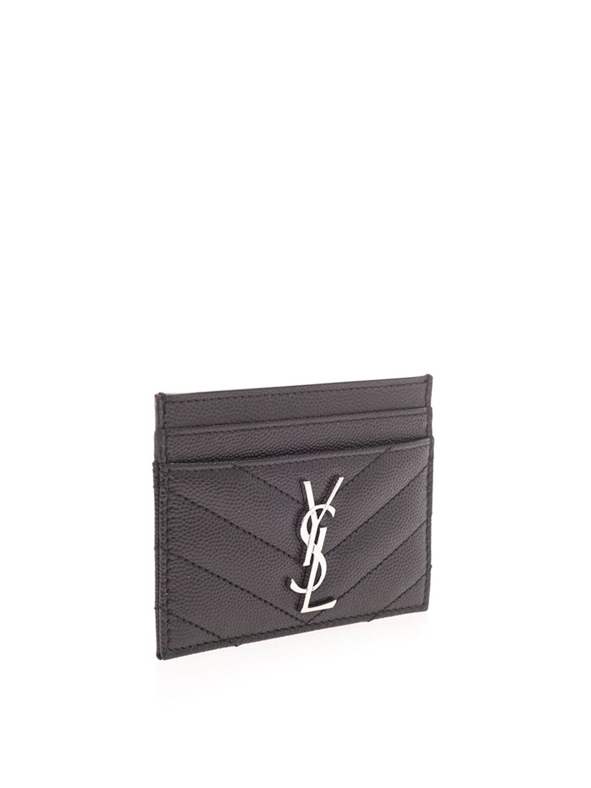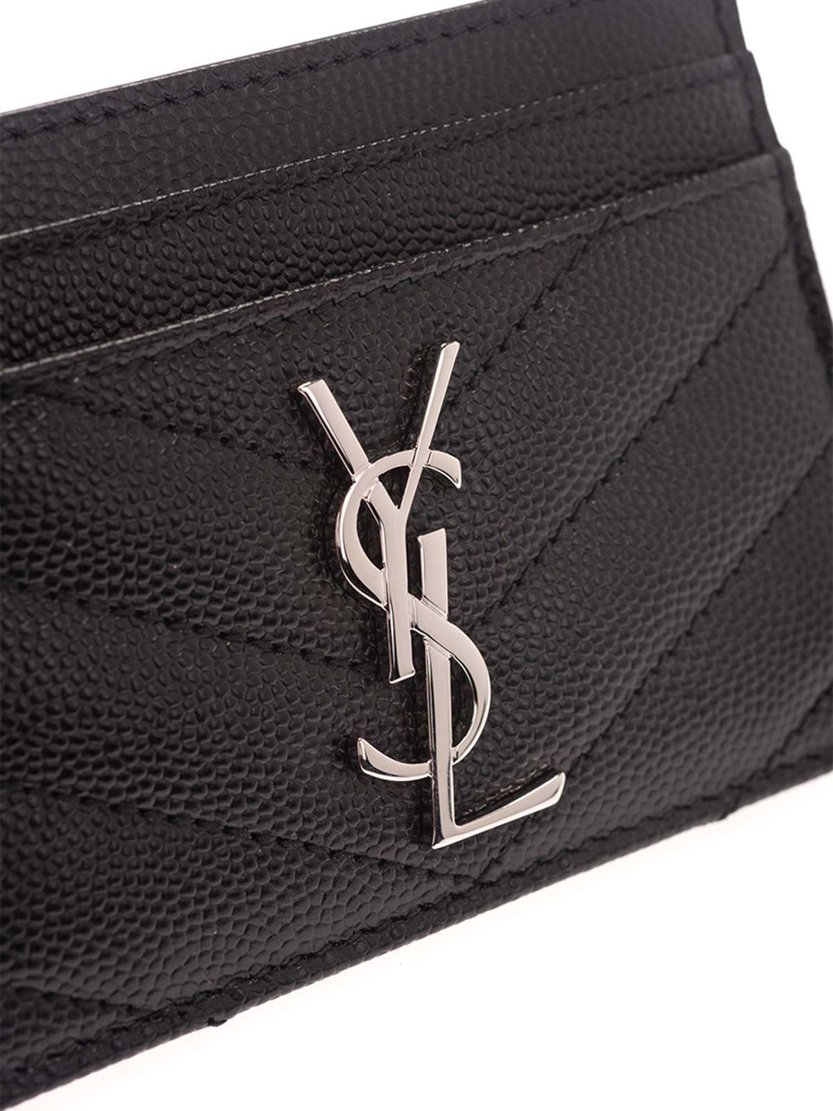 Textured leather card holder Color: black Metal ysl logo Quilted stitching Silver finish metalware 5 card slots