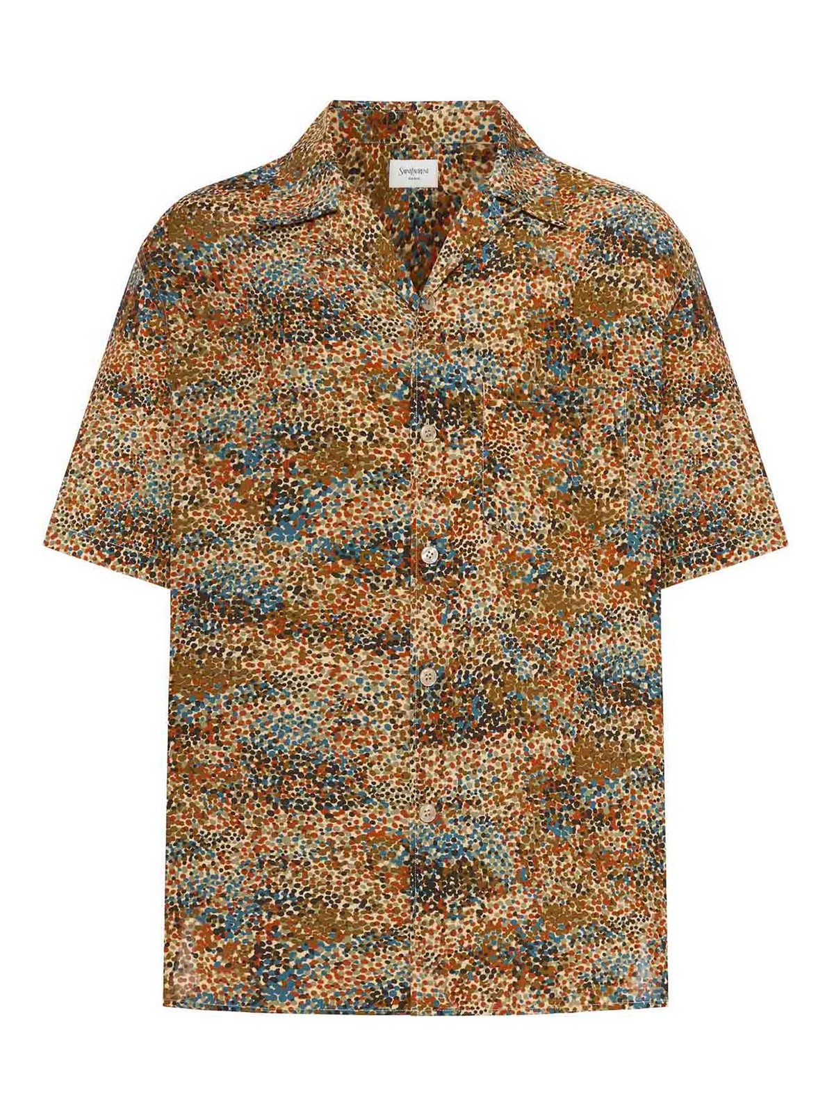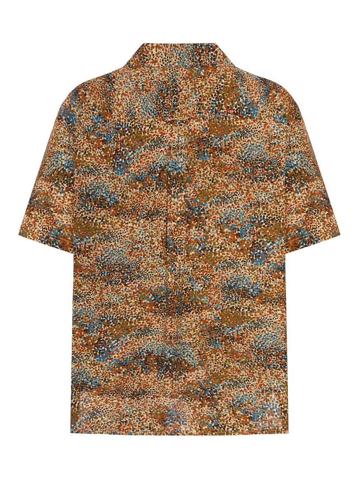 multicolor micro-dotted pattern, bowling collar, front button closure, short sleeves, patch chest pocket, back yoke with center pleat, straight hem, regular fit, color: multicolor
