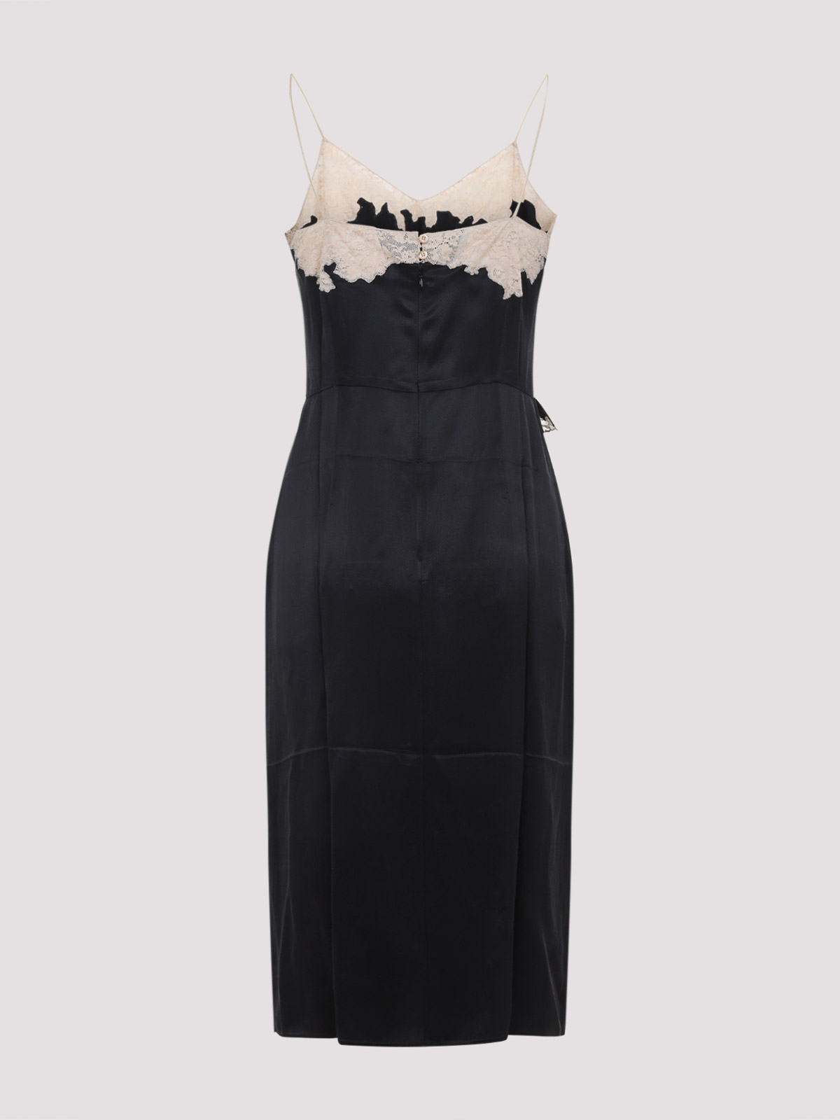 Prada black midi silk dress. black silk with contrasting beige lace embroidery. spaghetti straps, bra-like silhouette on front panel, midi length, zip fastening on back panel, regular fit.