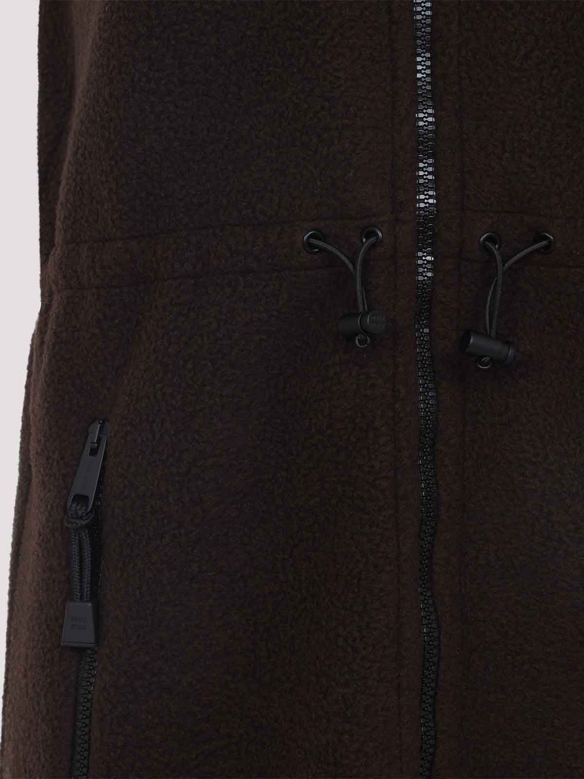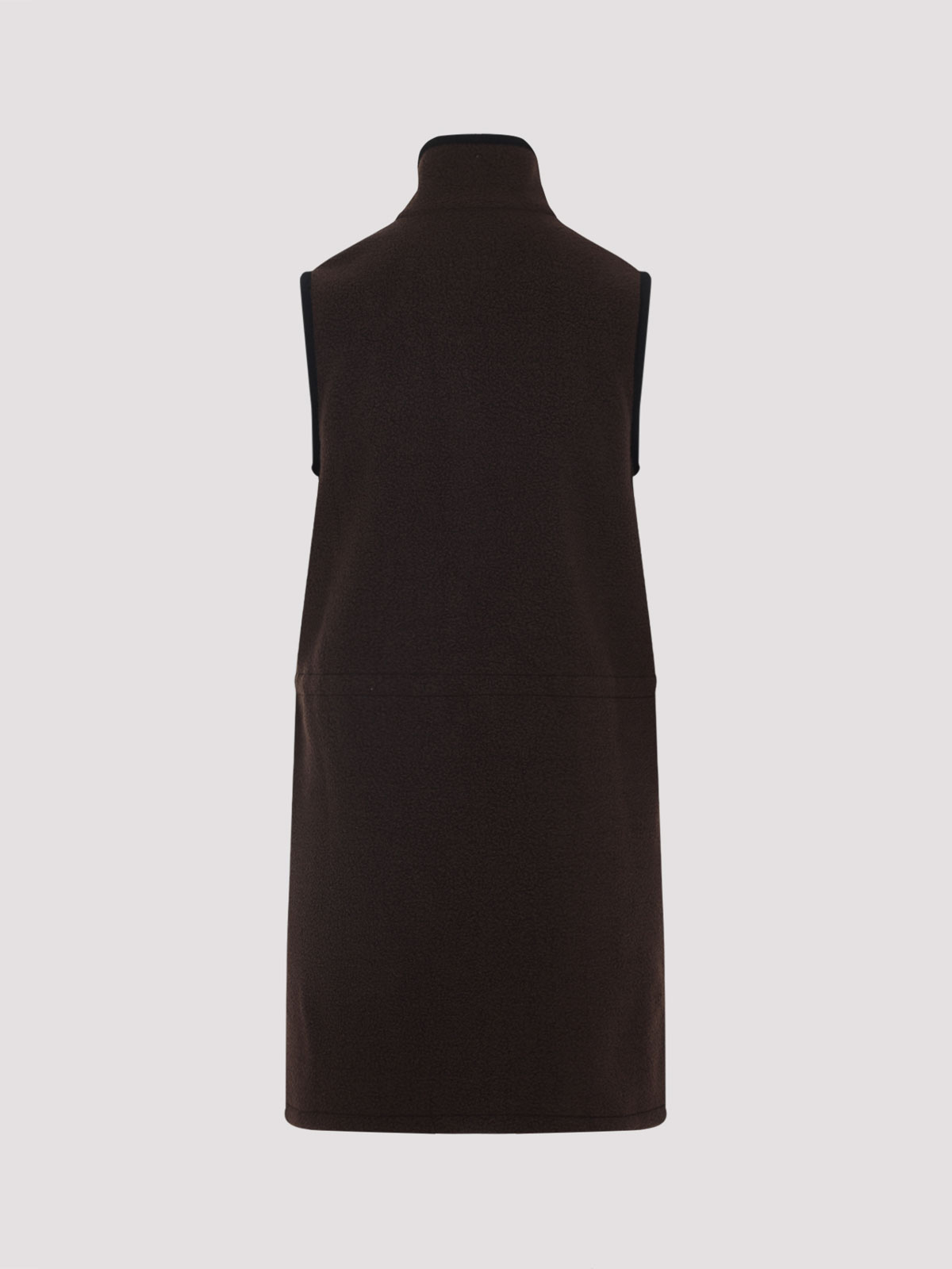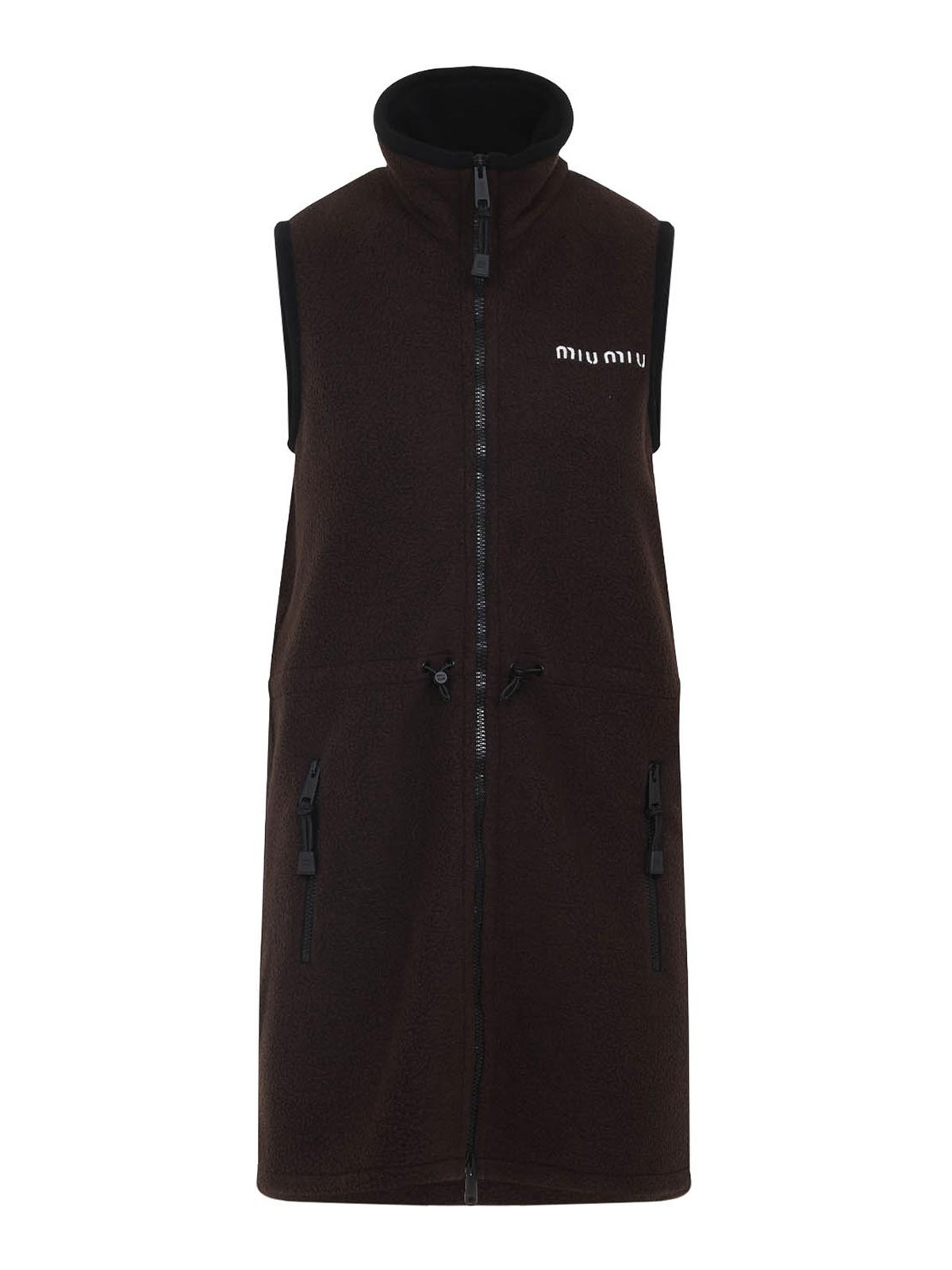 Miu miu ebony brown dress. crafted in recycled polyester, virgin wool and polyacrilic. stand-up collar, front zipped fastening, chest contrasting white embroidered logo, sleeveless, side zipped pockets, midi-length, straight hem. ebony brown fabric with contrasting black edges.