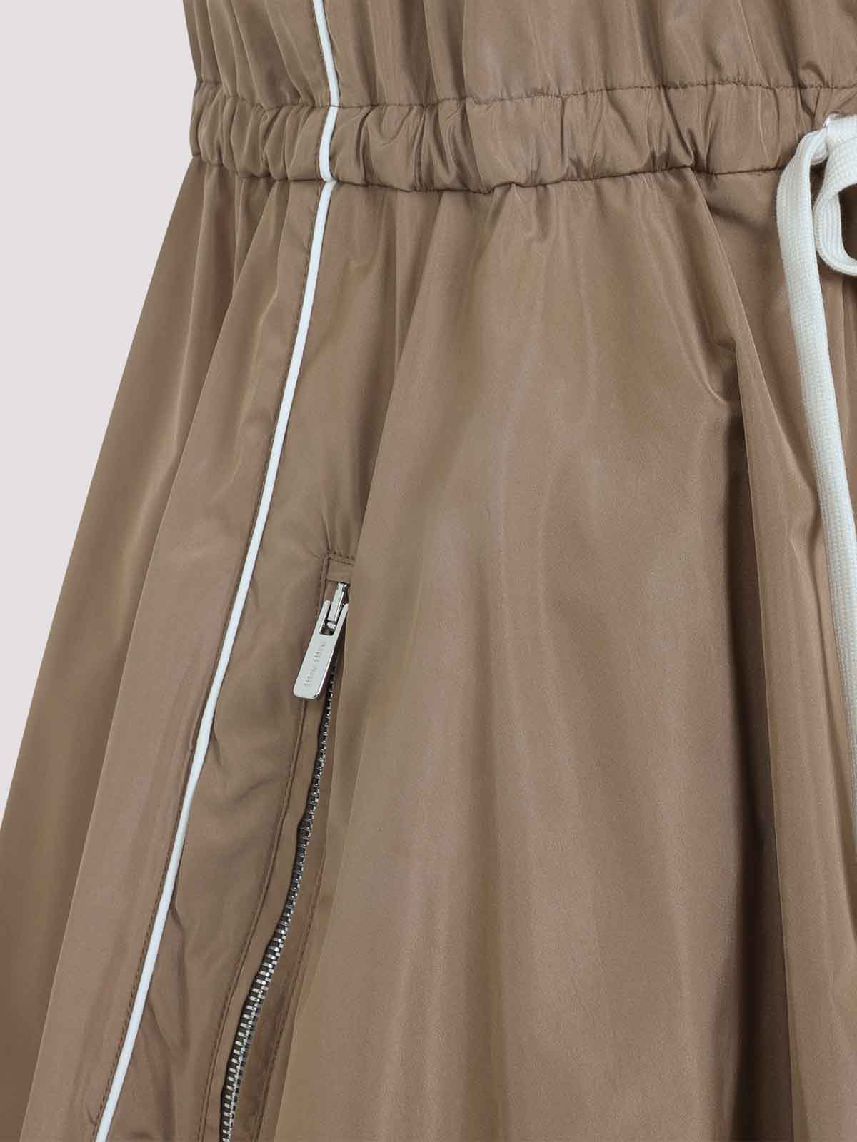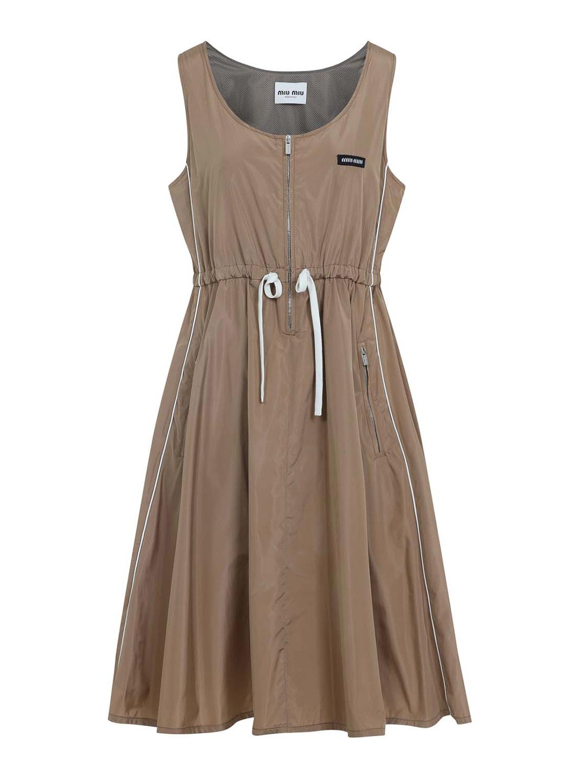 Miu miu beige mini silk dress. beige silk blend, crew neckline, fixed shoulder straps. front zip fastening, coulisse on waist, side zip pockets. midi length, logo patch on chest, regular fit.