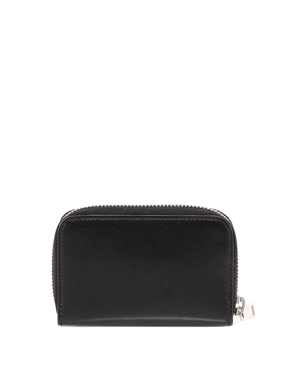 Leather wallet featuring metal logo, zip fastening and three internal compartments.