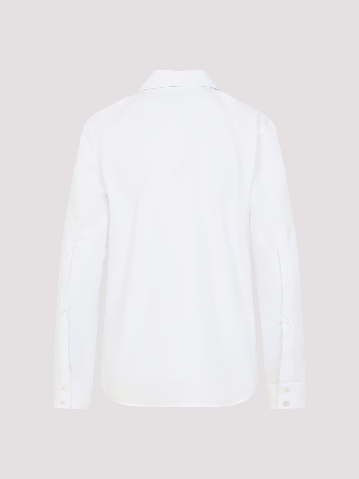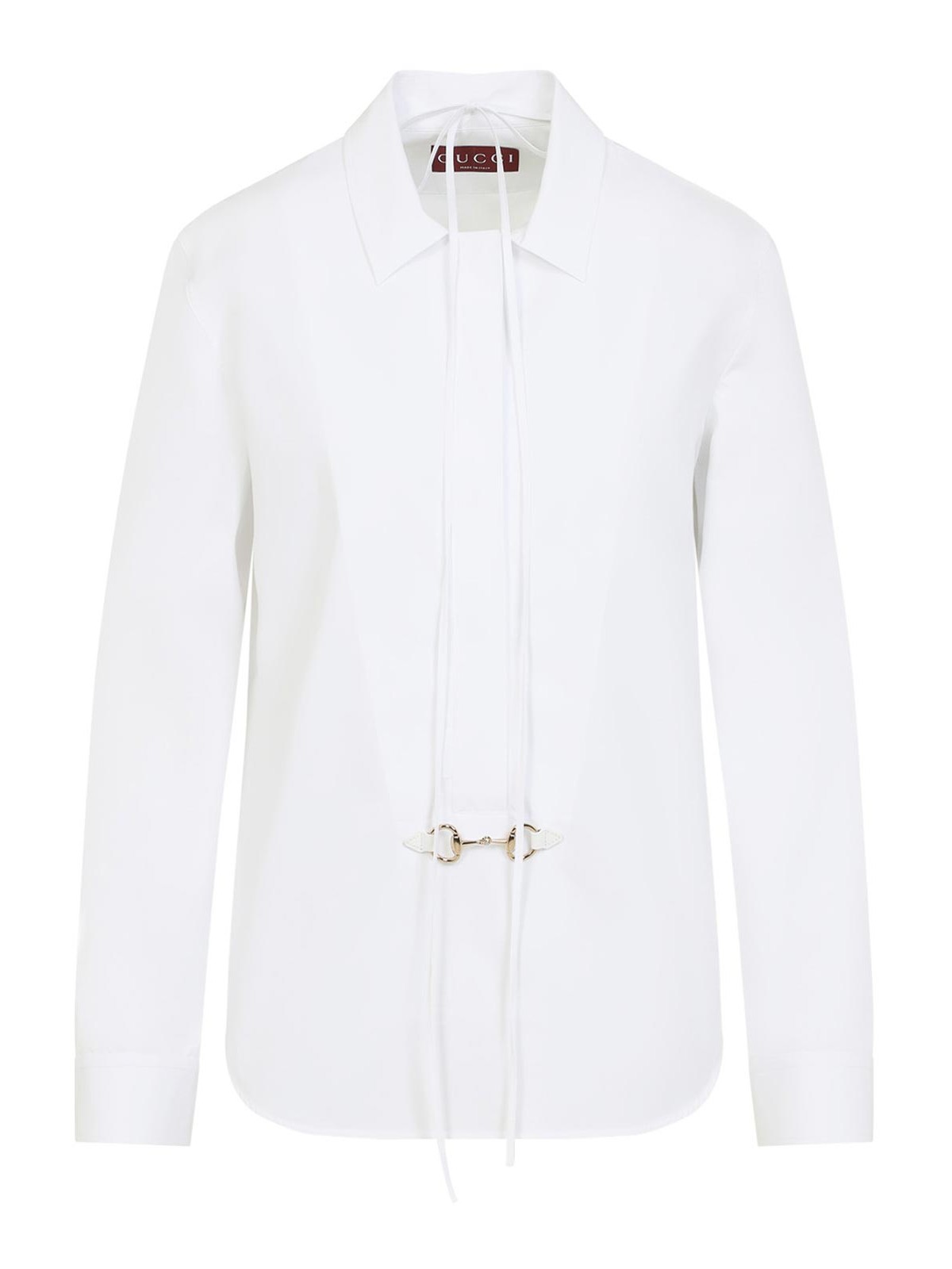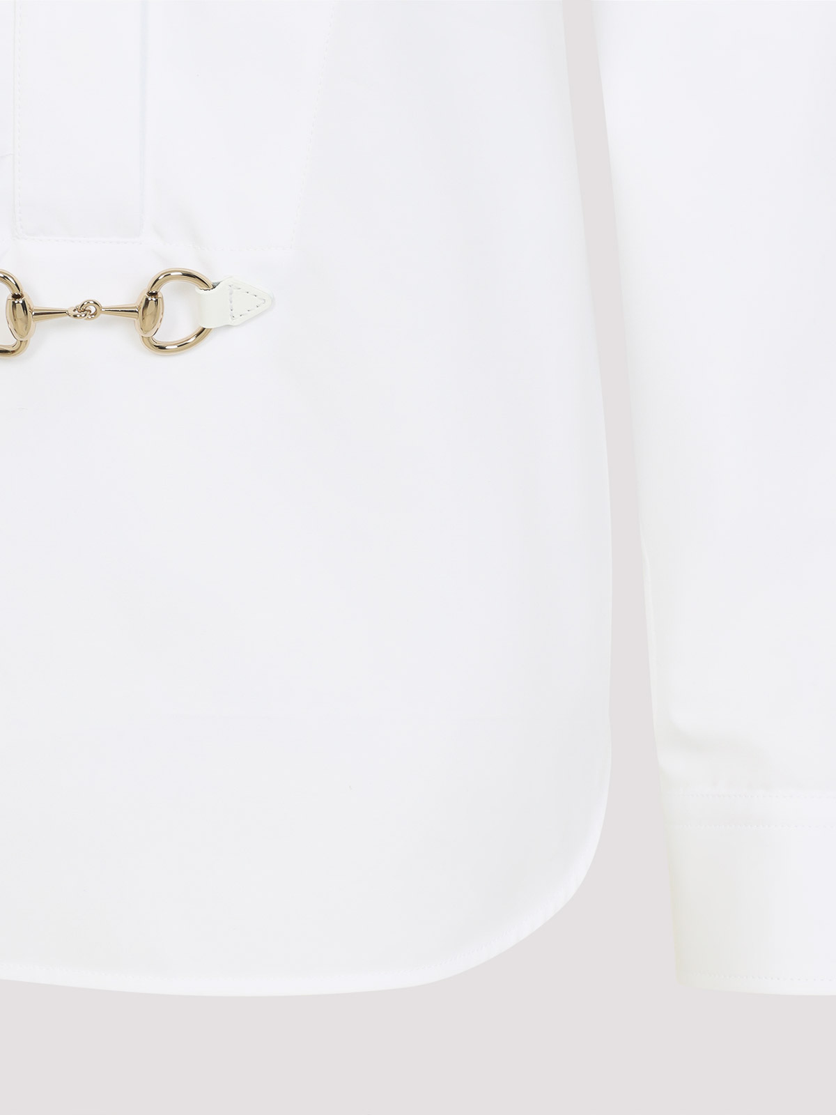 Gucci white cotton morsetto shirt. pure white cotton shirt, pointed collar, tonal strap, front concealing half buttoned fastening, front gold-tone metallic signature gancini, long sleeves, buttoned cuffs, round hem, tonal stitching.
