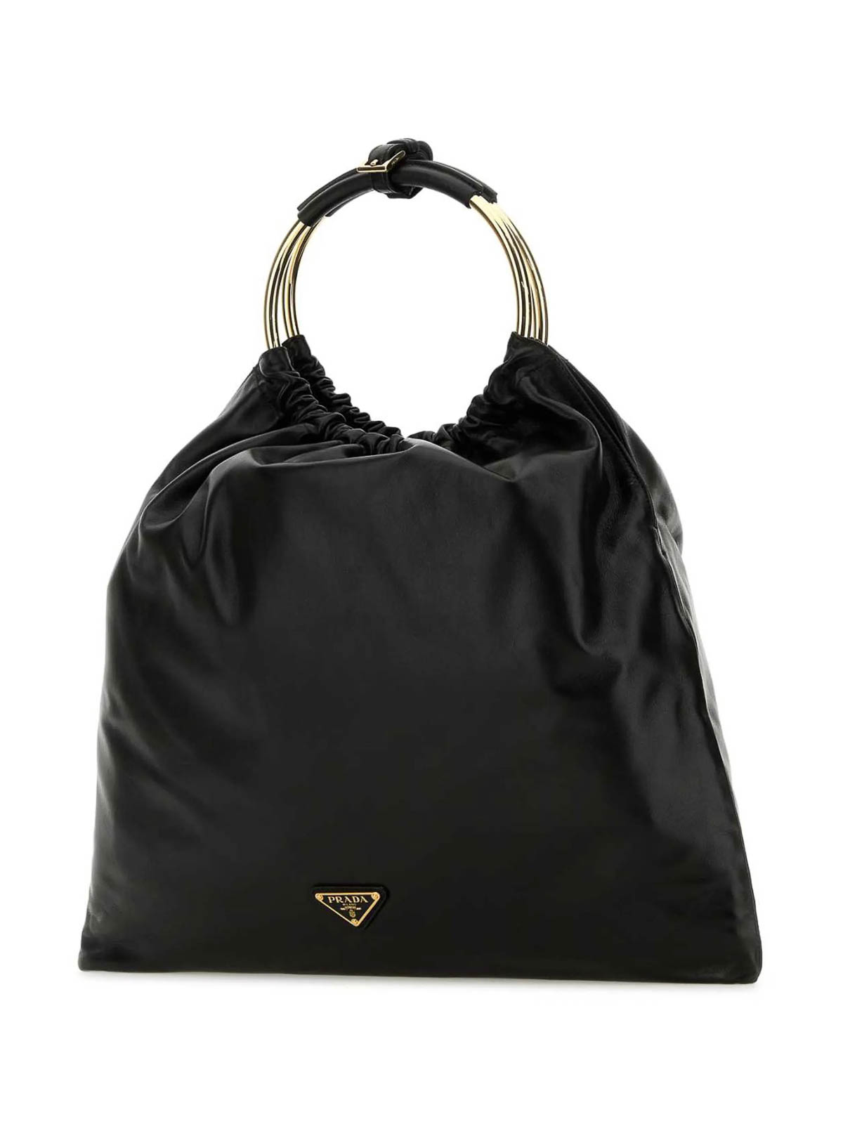 black smooth grain top buckle top drawstring two top handles strap detailing slouch body triangle logo main compartment