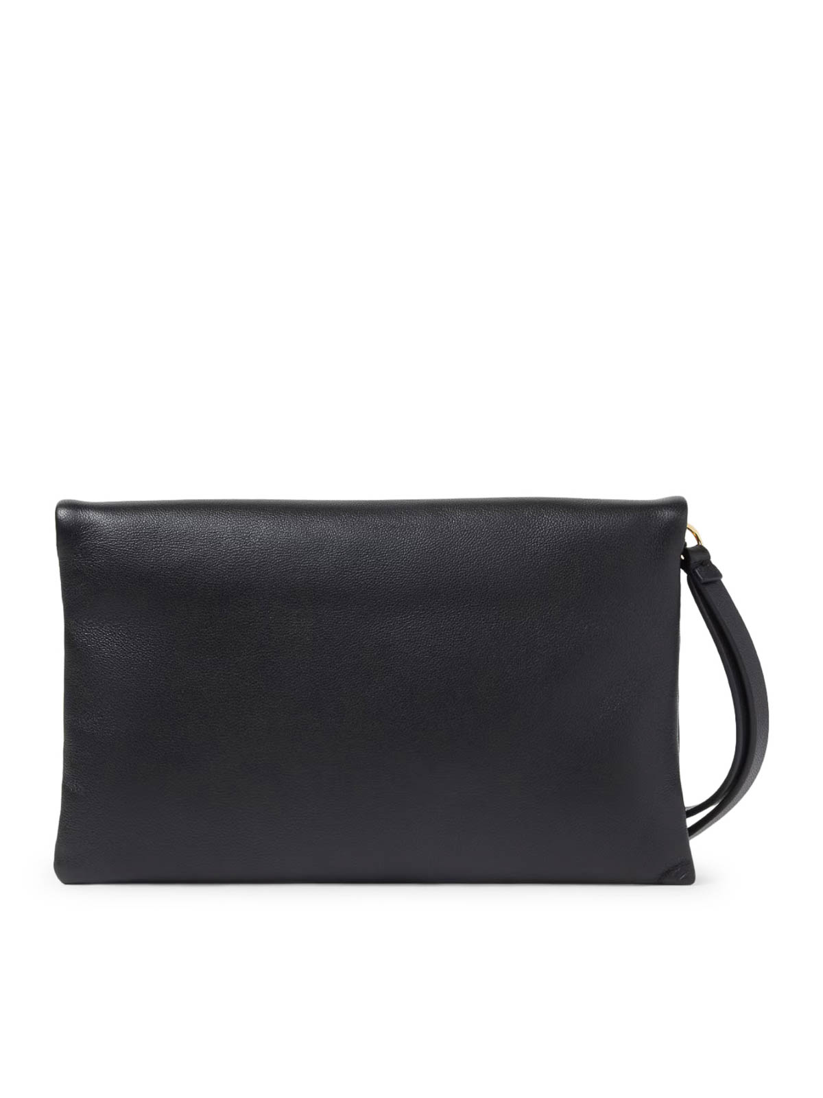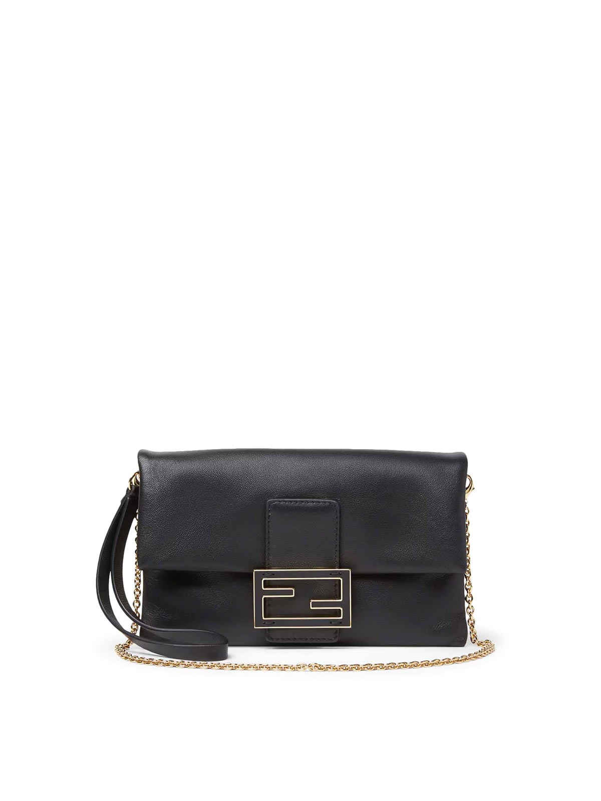 Nappa leather baguette mom pouch, mamma baguette pouch with soft flap, ff closure with tone-on-tone leather insert, lined interior, can be carried by hand or over the shoulder, leather wrist strap, removable chain shoulder strap, made of black nappa leather, gold-finish metalware, height: 13 cm, depth: 3 cm, width: 21 cm, shoulder strap drop: 15 cm, color: black