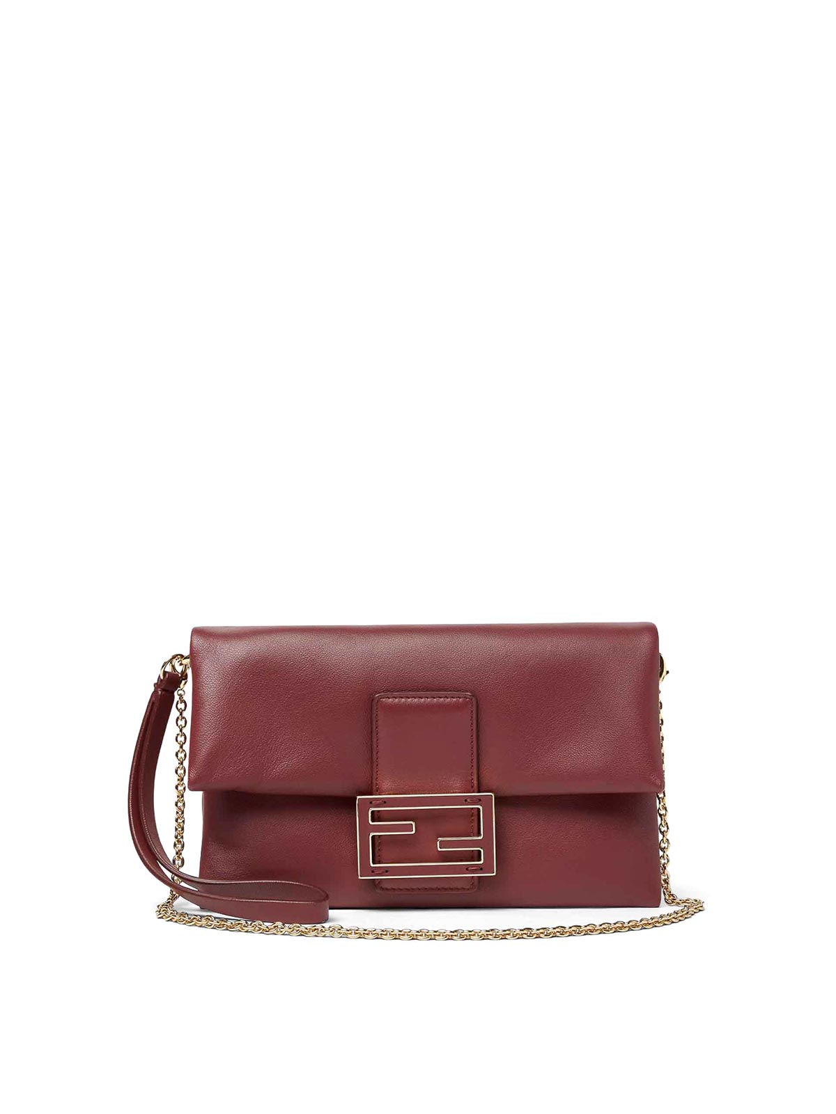 mamma baguette pouch with soft flap, ff closure with tone-on-tone leather insert, lined interior, can be carried by hand or over the shoulder, leather wrist strap, removable chain shoulder strap, made of black nappa leather, gold-finish metalware, height: 13 cm, depth: 3 cm, width: 21 cm, shoulder strap drop: 15 cm, color: dark red