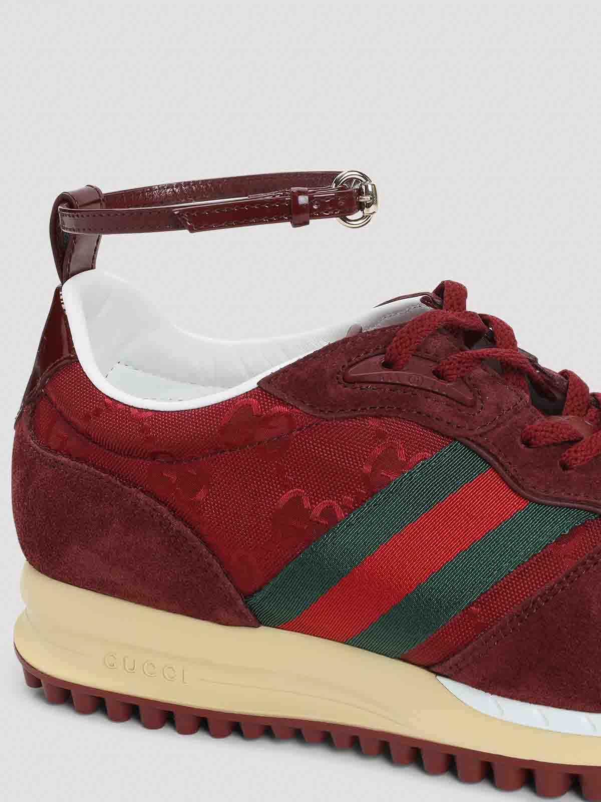 Gucci nora red leather sneakers. crafted from red rosso ancora suede leather and gg nylon, almond toe, lace-up fastening, embossed gg leather tongue, green and red web detail, tonal patent leather at the heel, detachable ankle strap, branded insole and fabric lining, embossed logo on the yellowing rubber outsole.