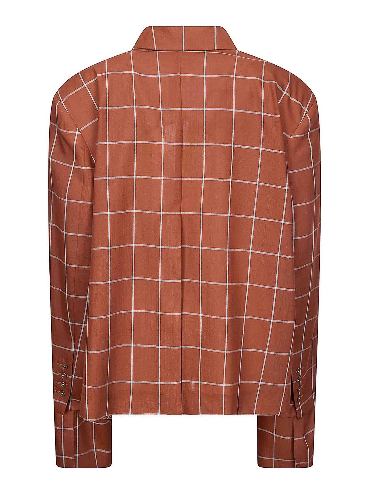 Oversized blazer with wide shoulders, double-breasted closure, wide collar, front pockets.