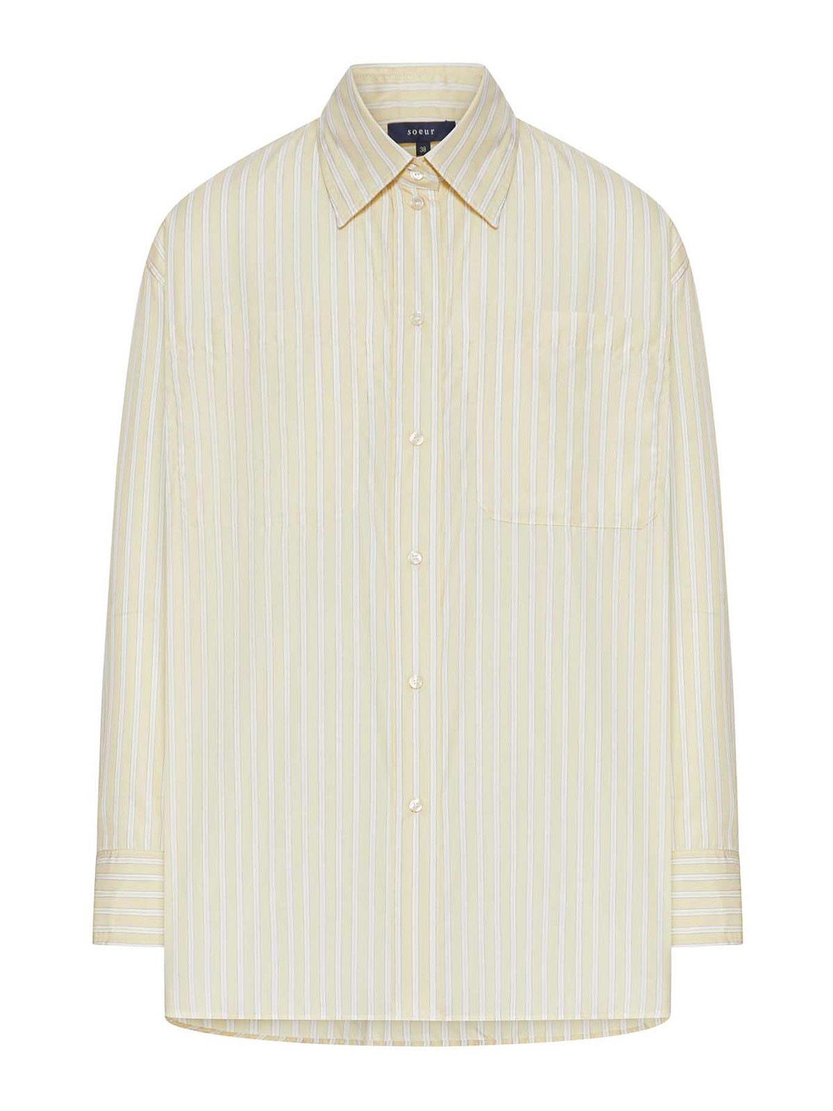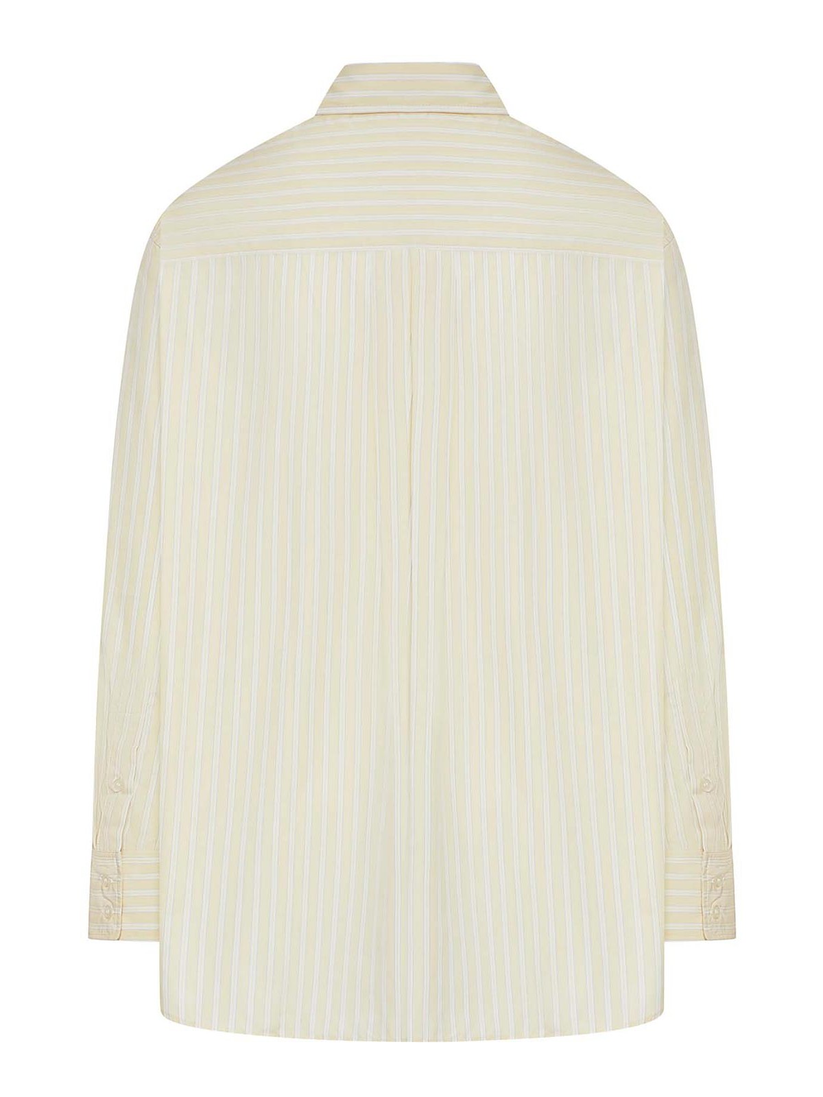classic collar with front button closure, slightly dropped shoulders, long sleeves with structured cuffs and button, patch chest pocket, pastel yellow and white vertical stripe pattern, back yoke with center pleat, slightly rounded hem, oversized fit, 100% cotton, color: ecru yellow