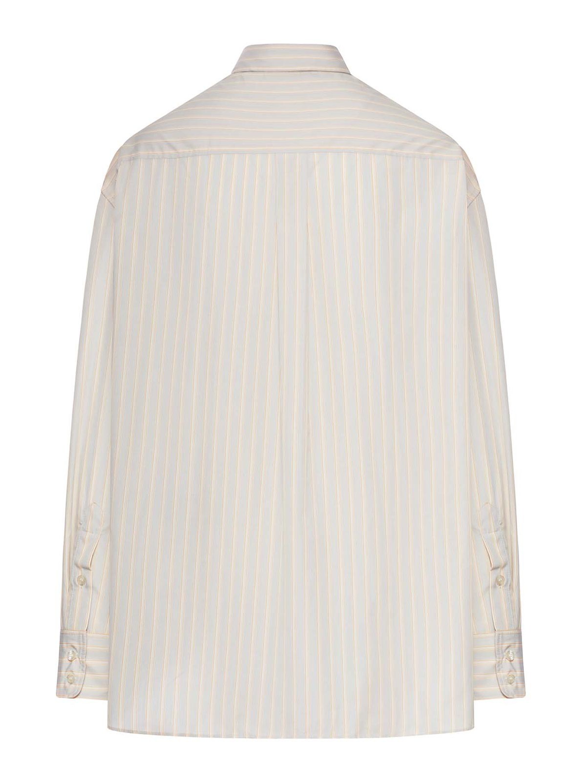 classic collar with front button closure, slightly dropped shoulders, long sleeves with structured cuffs and button, patch chest pocket, vertical striped pattern, back yoke with center pleat, slightly rounded hem, oversized fit, 100% cotton, color: orange gris