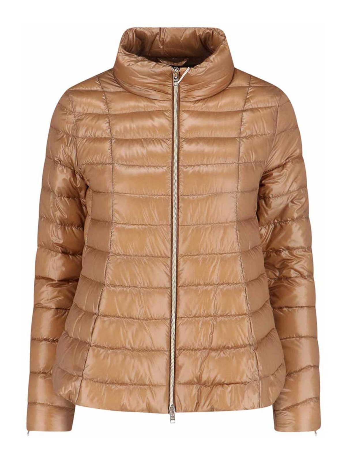 Herno padded down jacket in brown fabric, light shade, high collar, zip closure, long sleeves, flared straight hem.