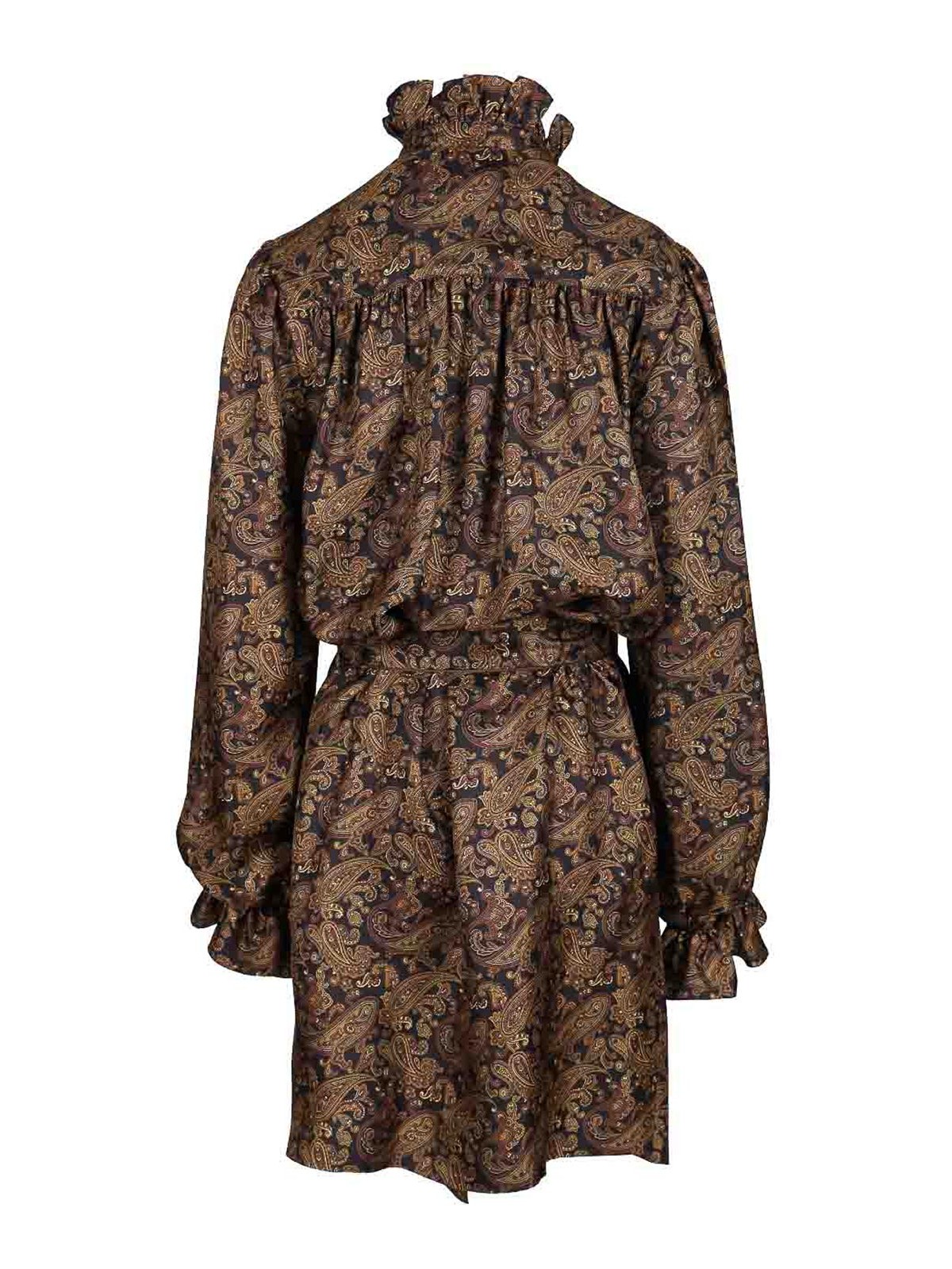 Dress made of silk mandarin collar button fastening on the front long poet sleeves with buttons belt at the waist side slits all-over paisley pattern