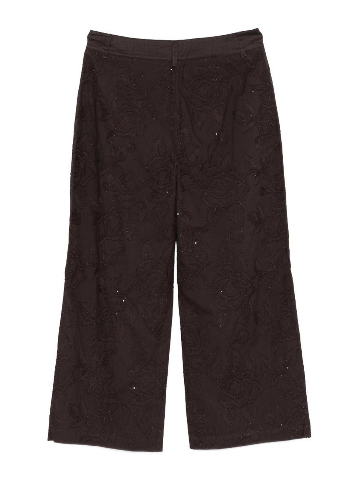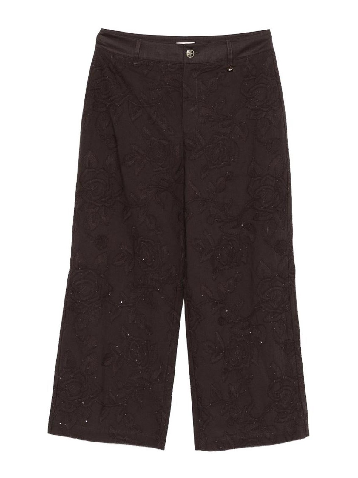 Brown floral embroidery sequin embellishment button fastening belt loops