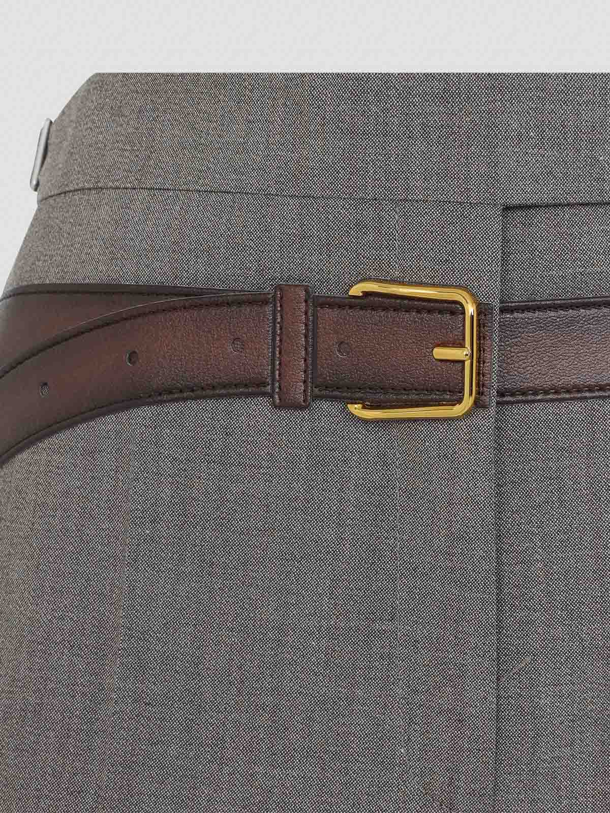 Prada clay grey wool pants. crafted in wool and polyester blend. front concealing zipped and hooked fastening, brown sewn belt, side pockets, back slit pockets, wide leg, high stitching on the hem, straight hem.