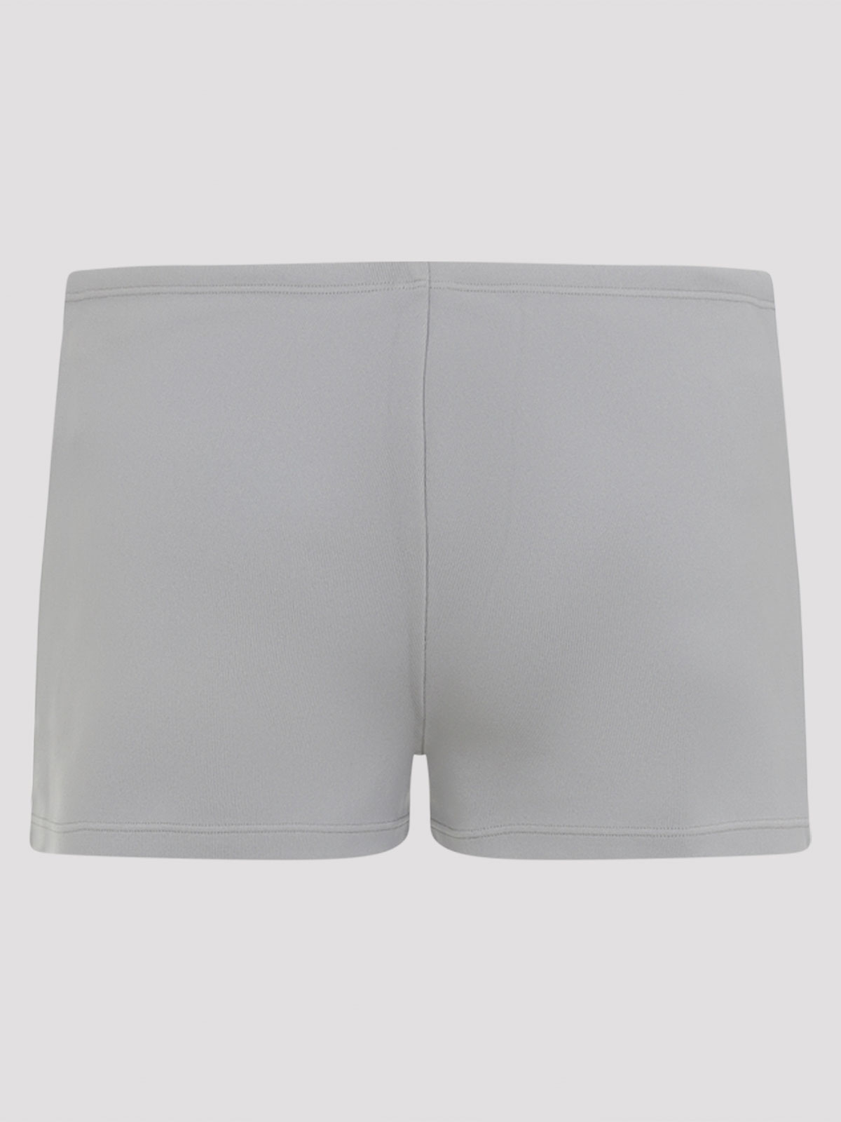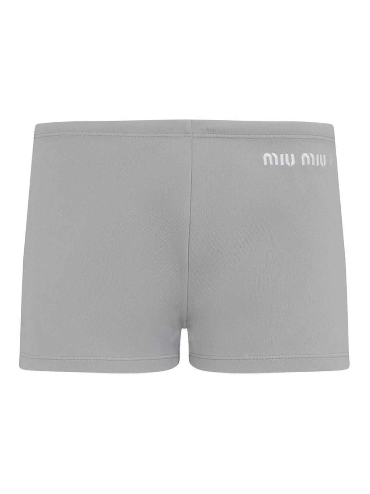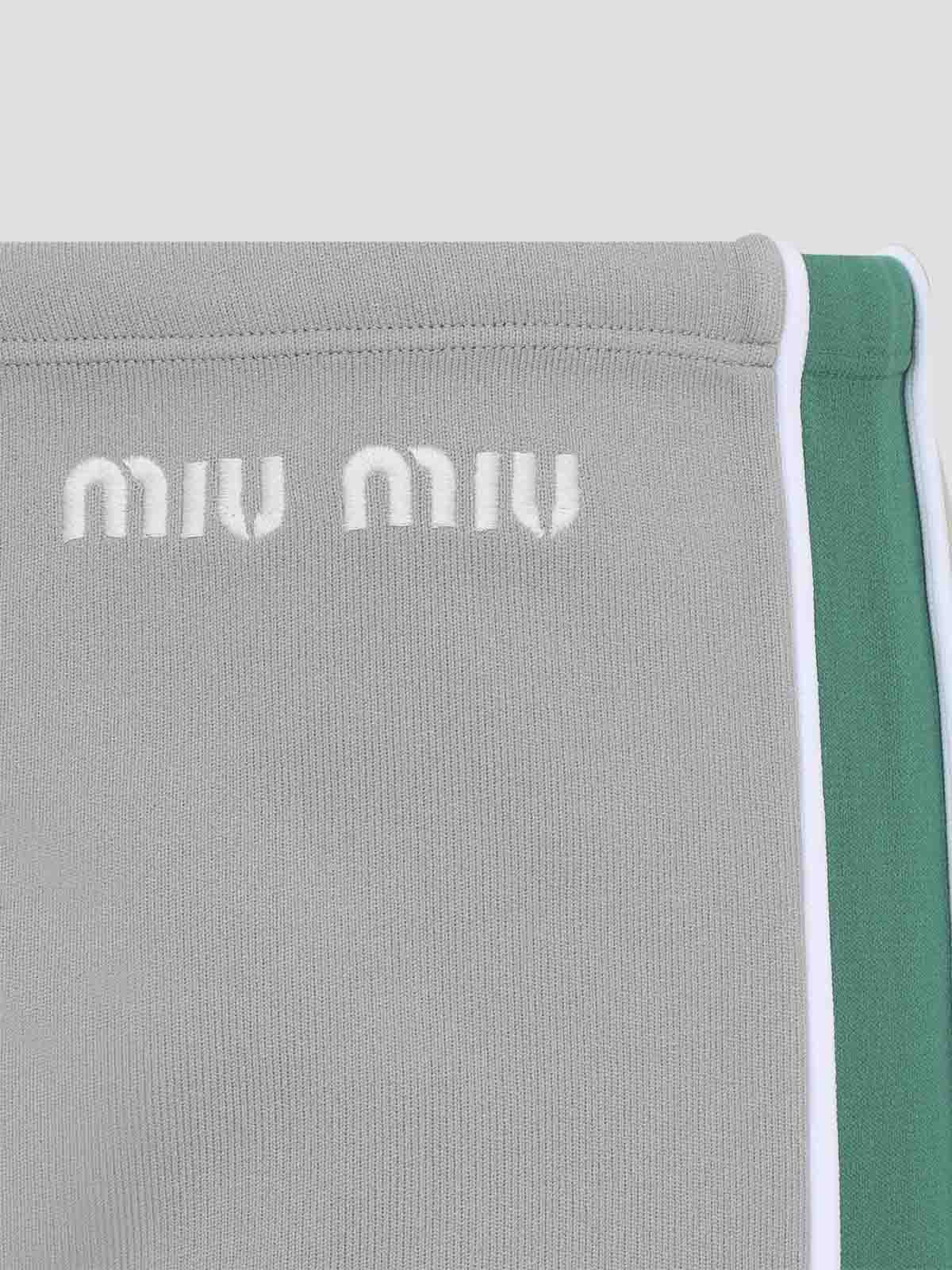Miu miu grey shorts. crafted in polyamide and elastane blend, low-rise, concealing drawstring at the waistband, side contrasting white embroidered logo, straight hem. white and green stripes along the sides.
