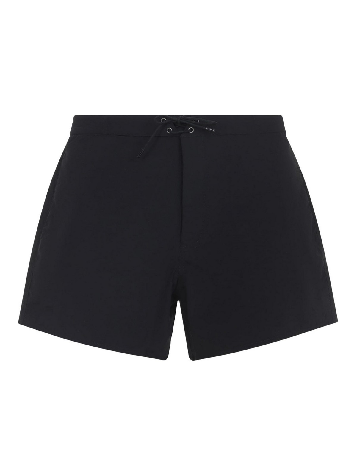 Saint laurent black polyamide swim shorts. black tech fabric, elastic waistband, front conceald button and drawstring fastening, tonal embroidered logo on the side, inseam side pockets.