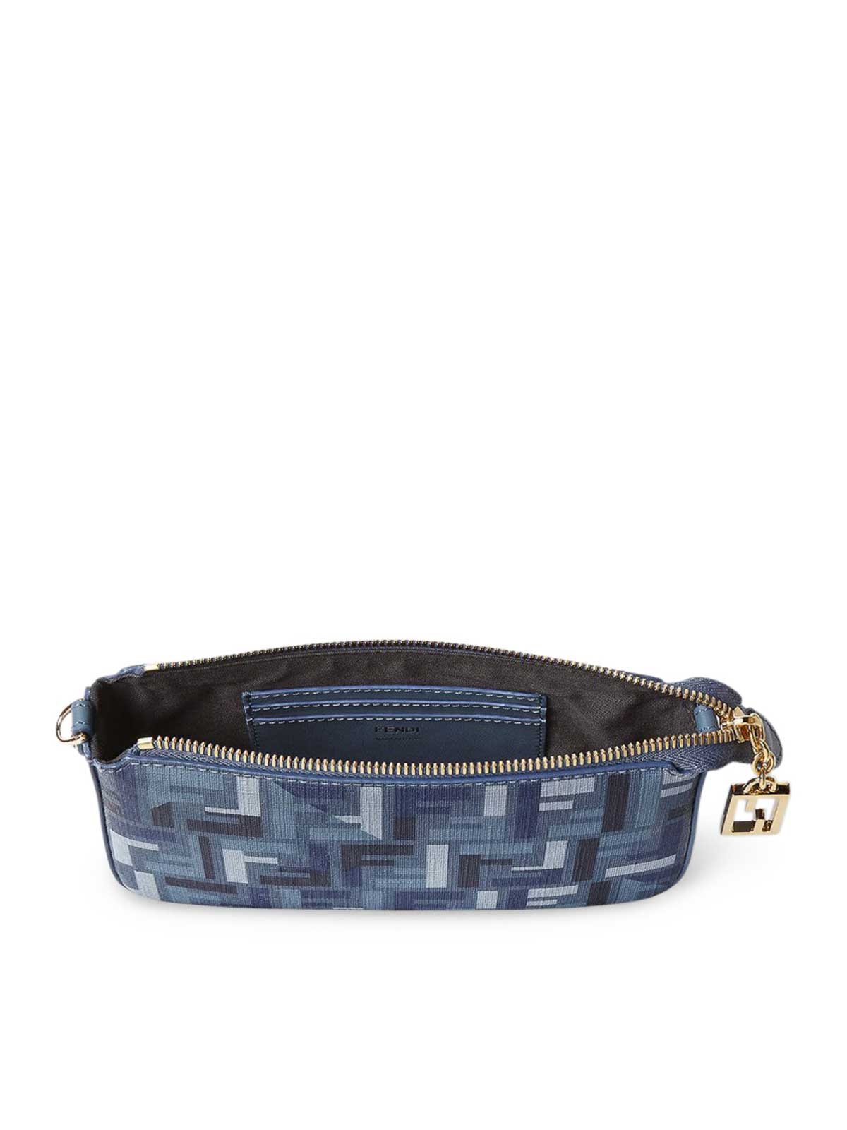 Baguette pouch in, iconic FF motif in shades of blue, with zip and zip puller with iconic FF motif, to, pocket with card holder slot, metal accessories with golden finish, can be carried by hand under the arm or crossbody, bodysuit, short in removable thin chain, long removable, myrtle color