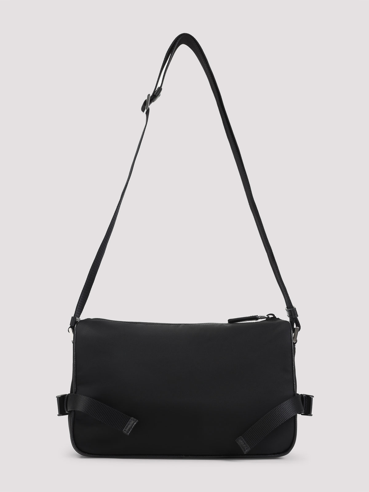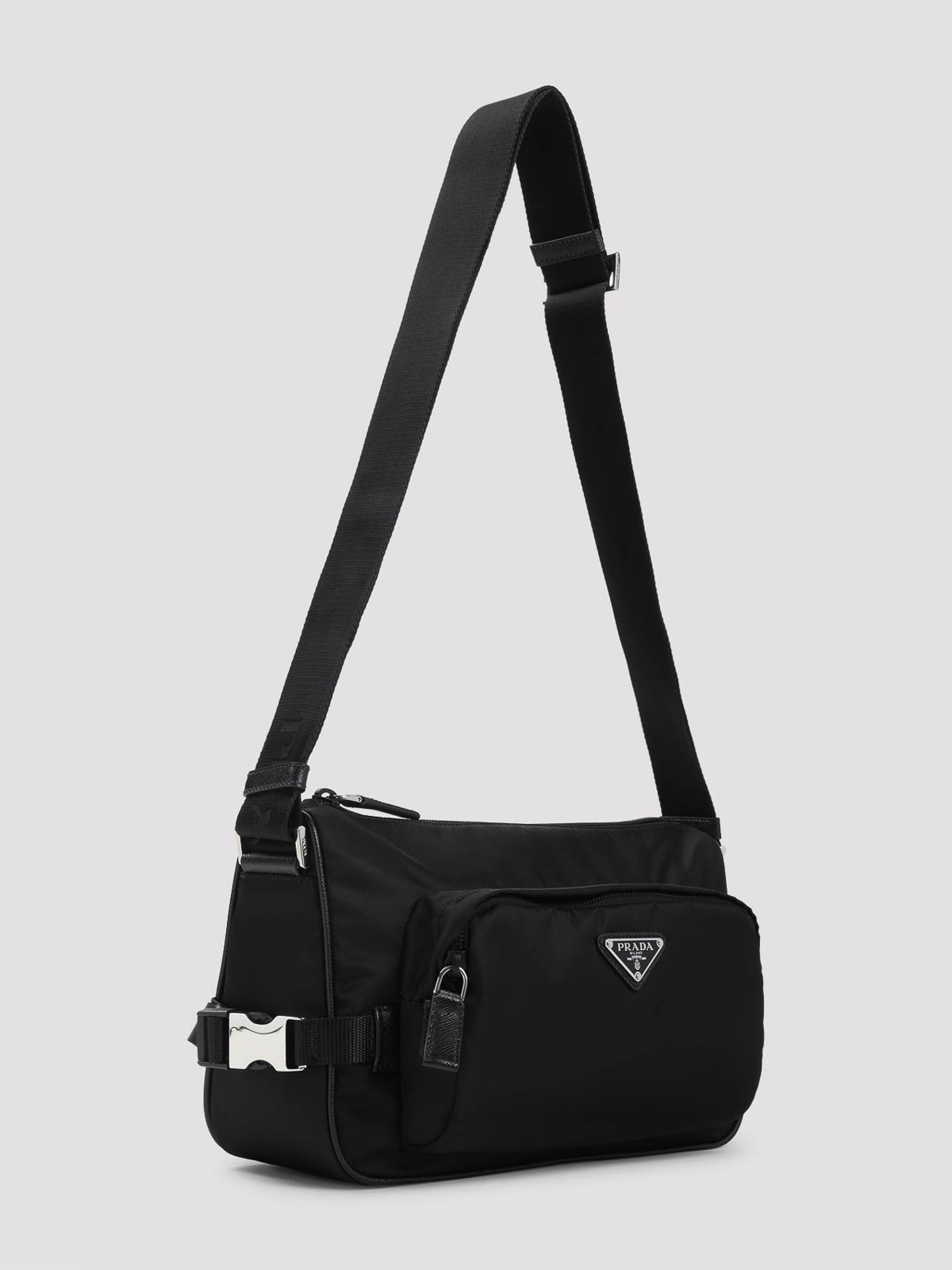 Prada black re-nylon and leather shoulder bag. black saffiano leather and re-nylon, adjustable nylon tape shoulder strap, zip fastening, zipped pocket. enameled metal triangle logo on the front, logo-print re-nylon lining, external zipper pocket.