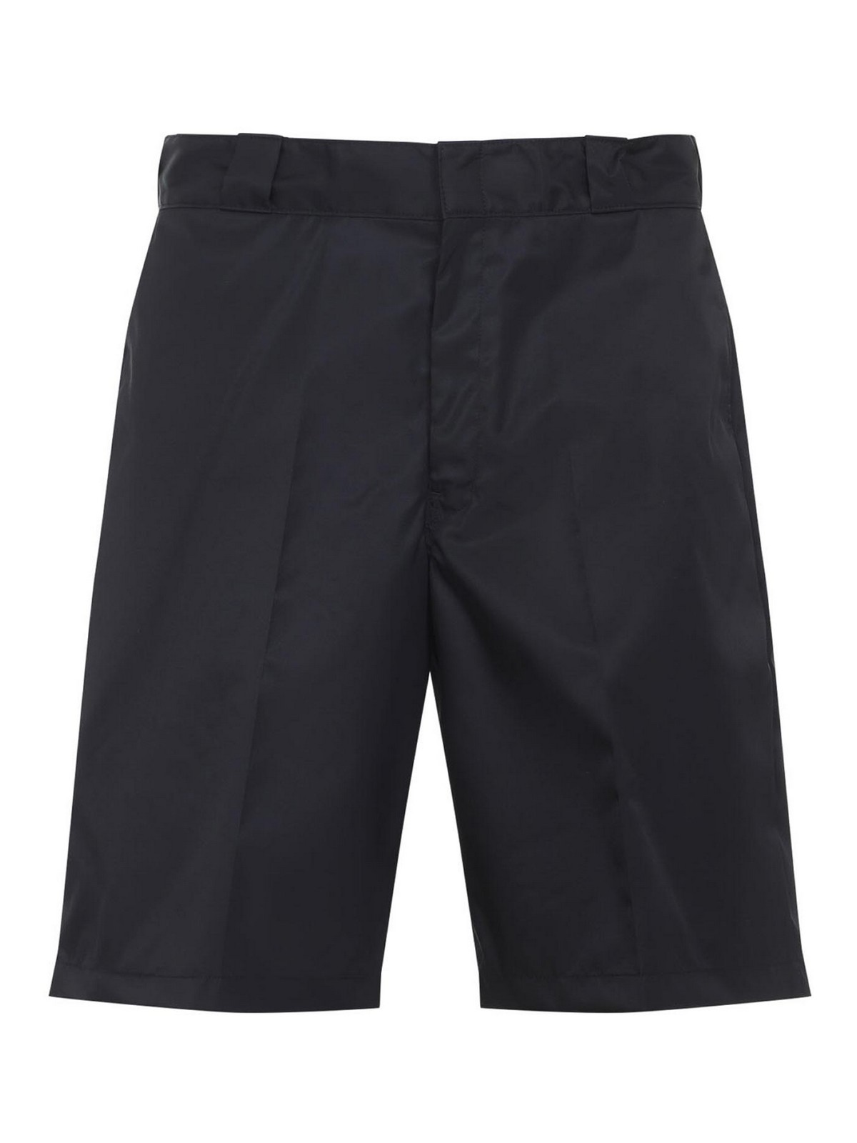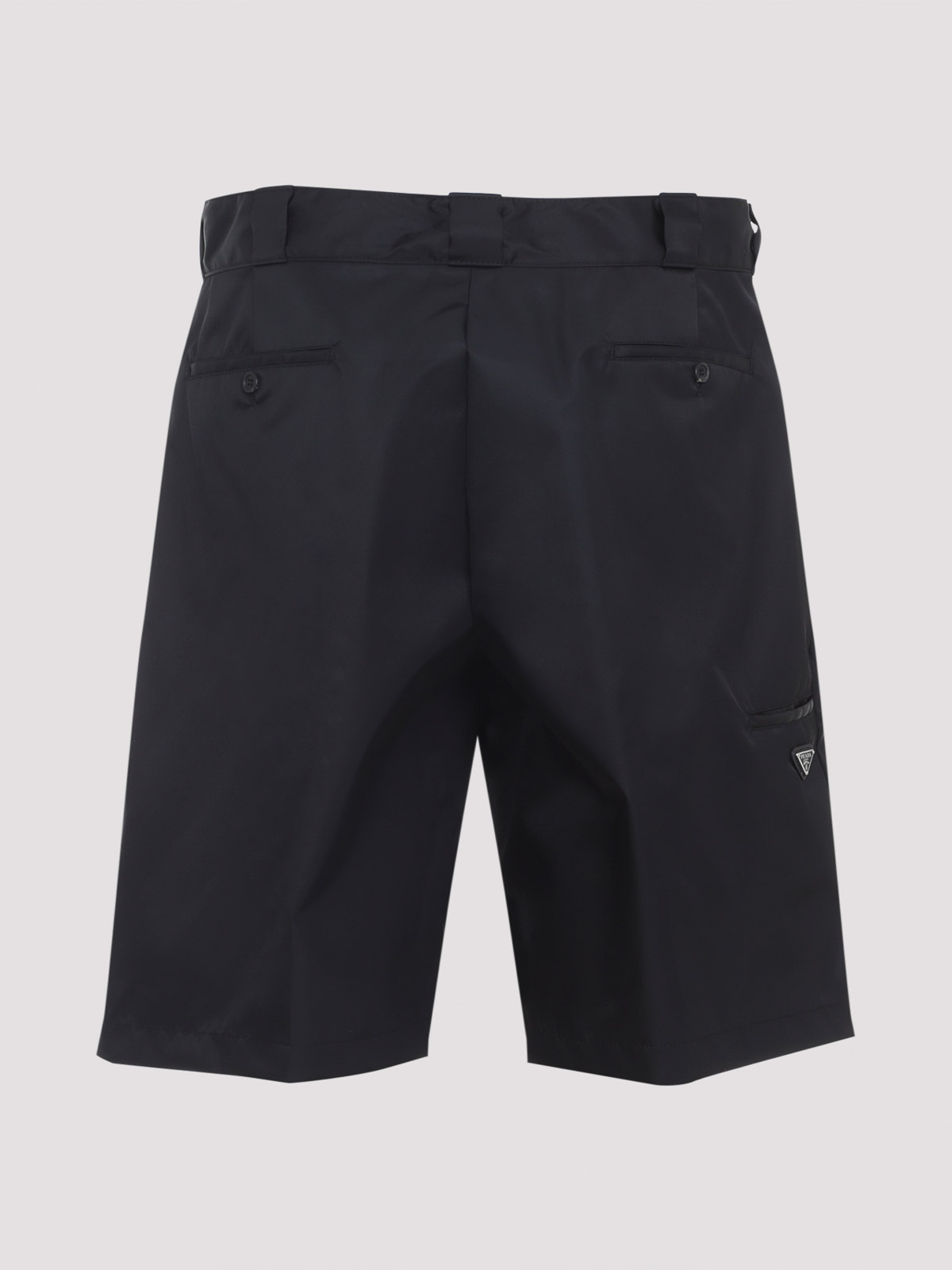Prada black re-nylon bermudas. crafted from black re-nylon, belt loops, front concealed hook and button fastening, slant pockets, welt pockets on the back, mini welt pocket and enamelled triangle logo details on the back, straight hem.