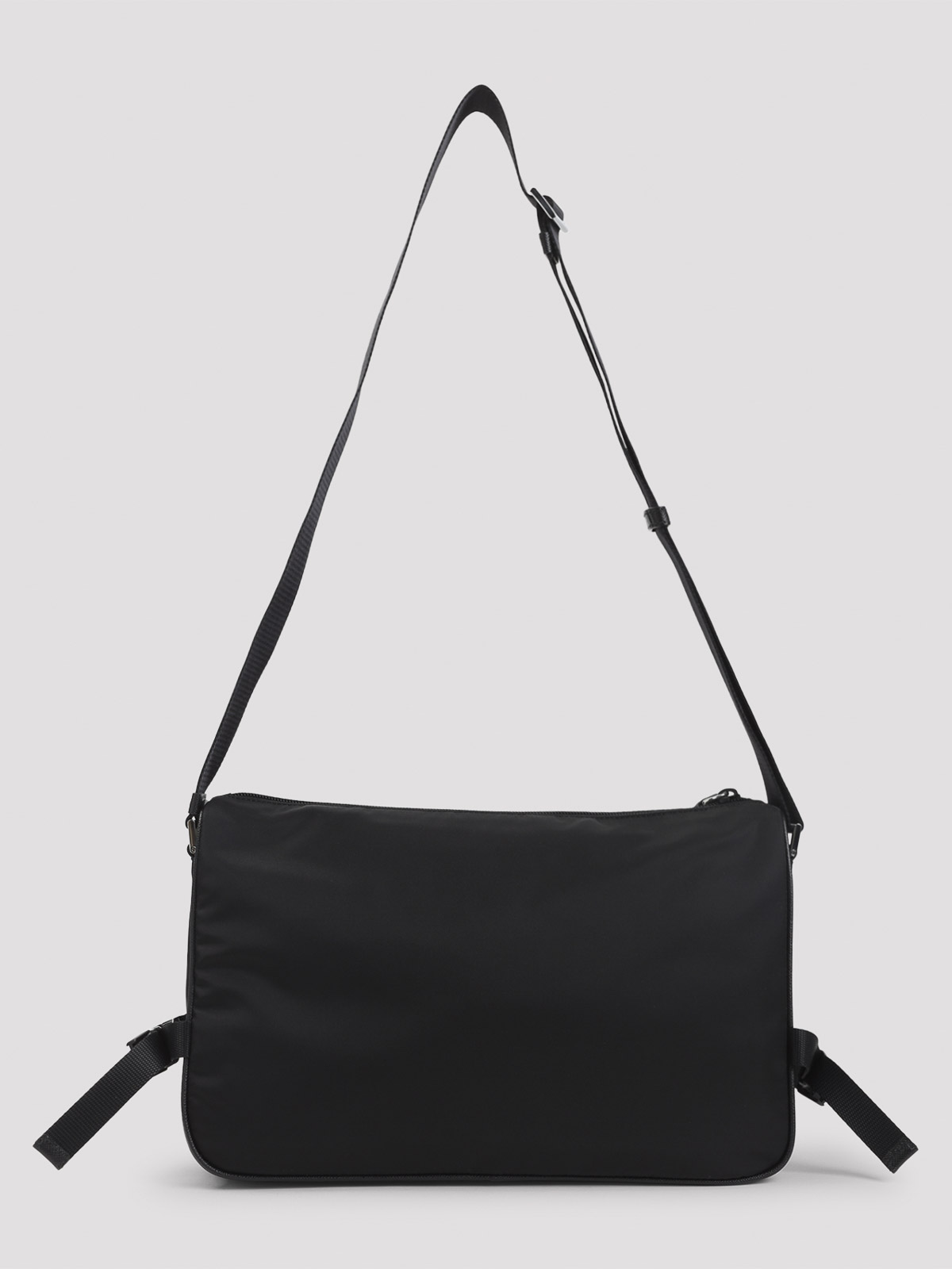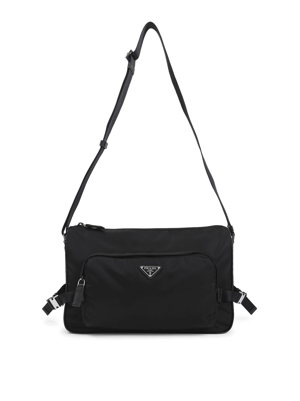 Prada black re-nylon shoulder bag. crafted from black re-nylon, featuring silver-toned hardware, a top zip fastening, a front zip pocket with an enameled triangle logo detail, two adjustable straps with side-release buckles on the sides, an adjustable shoulder strap, and an inner zip pocket.