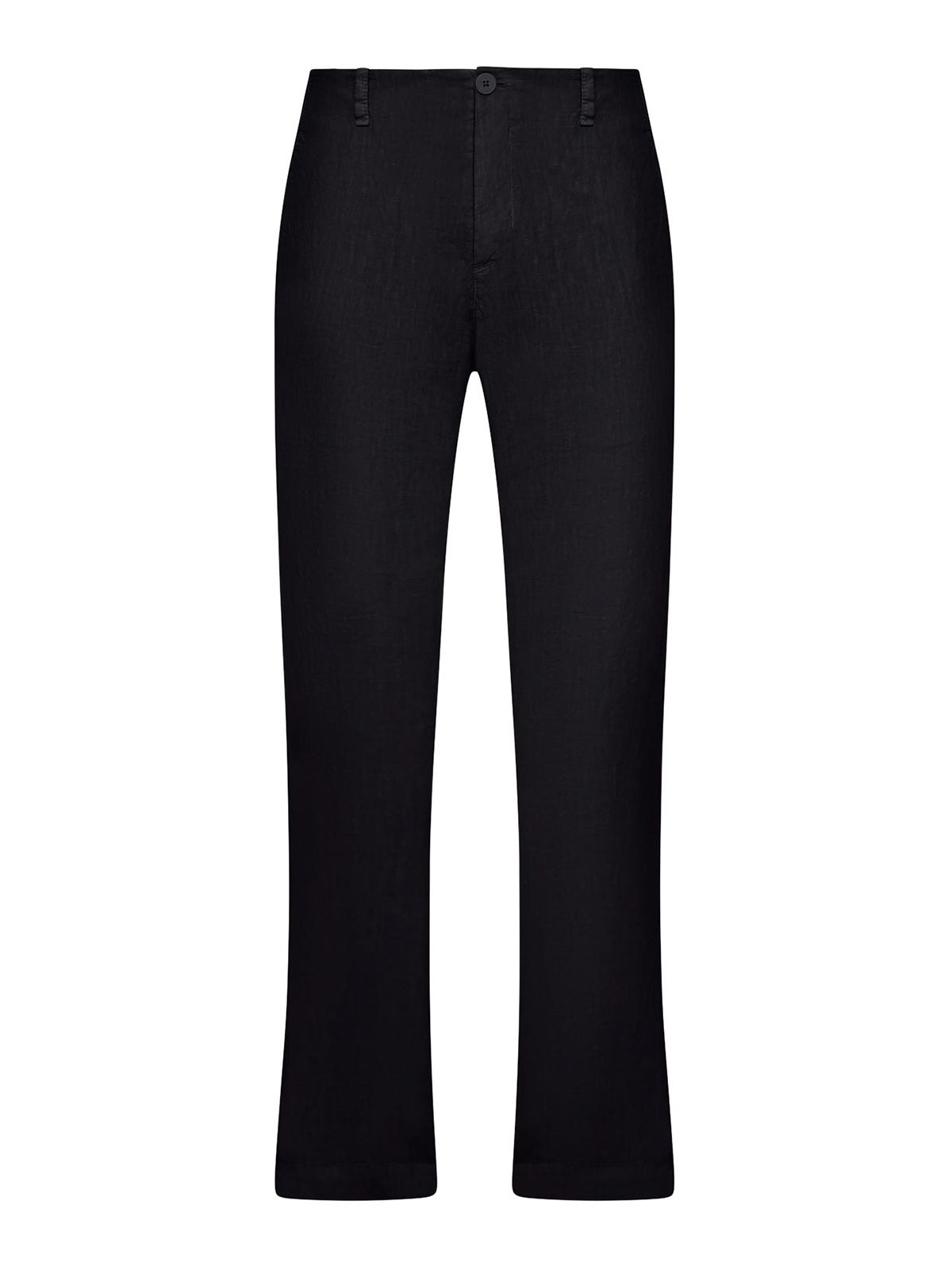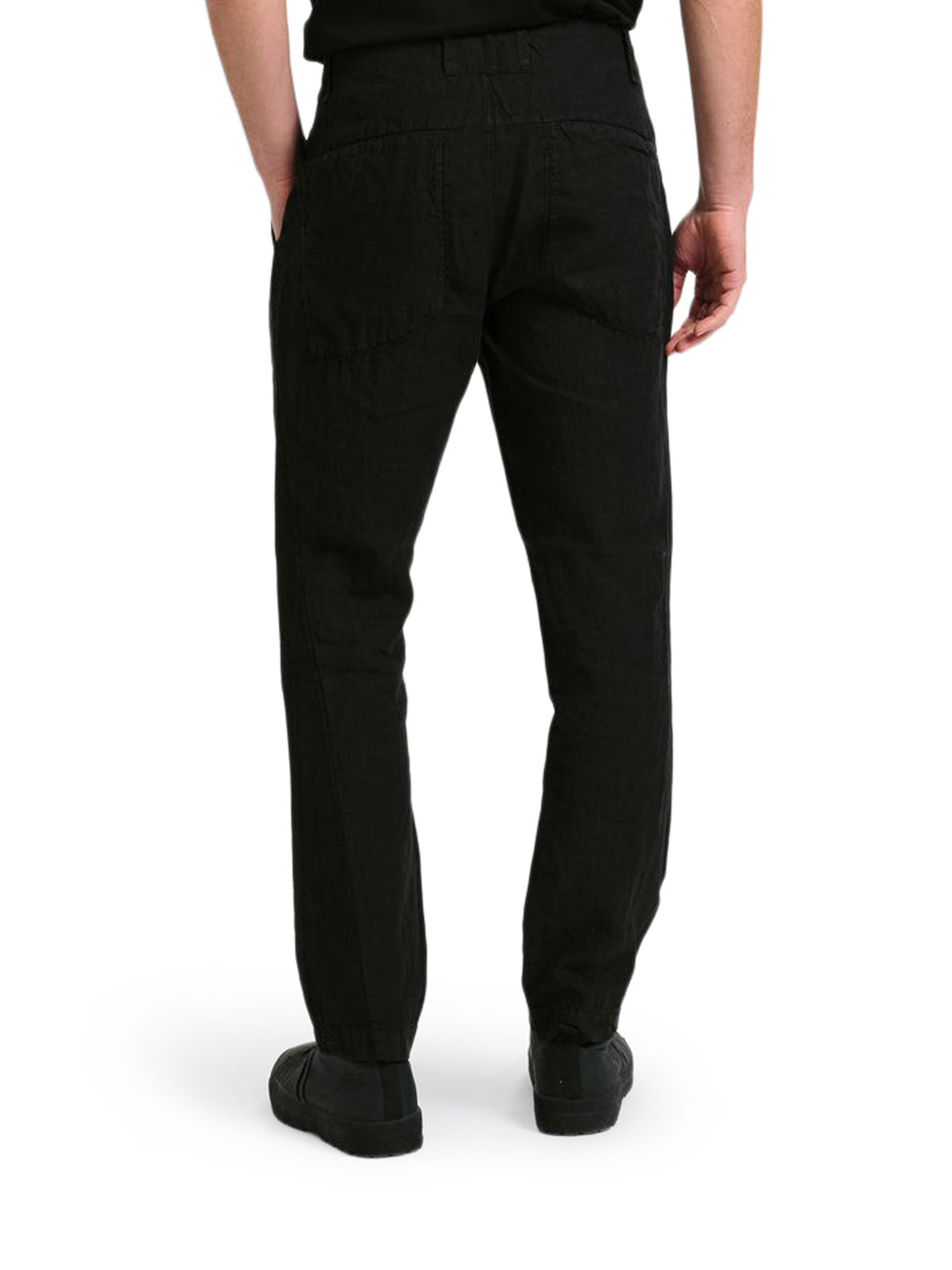 linen canvas, belt loops, front button closure, cotton buttons, front hip pockets, back yoke pockets, regular fit, garment dyed, color: black