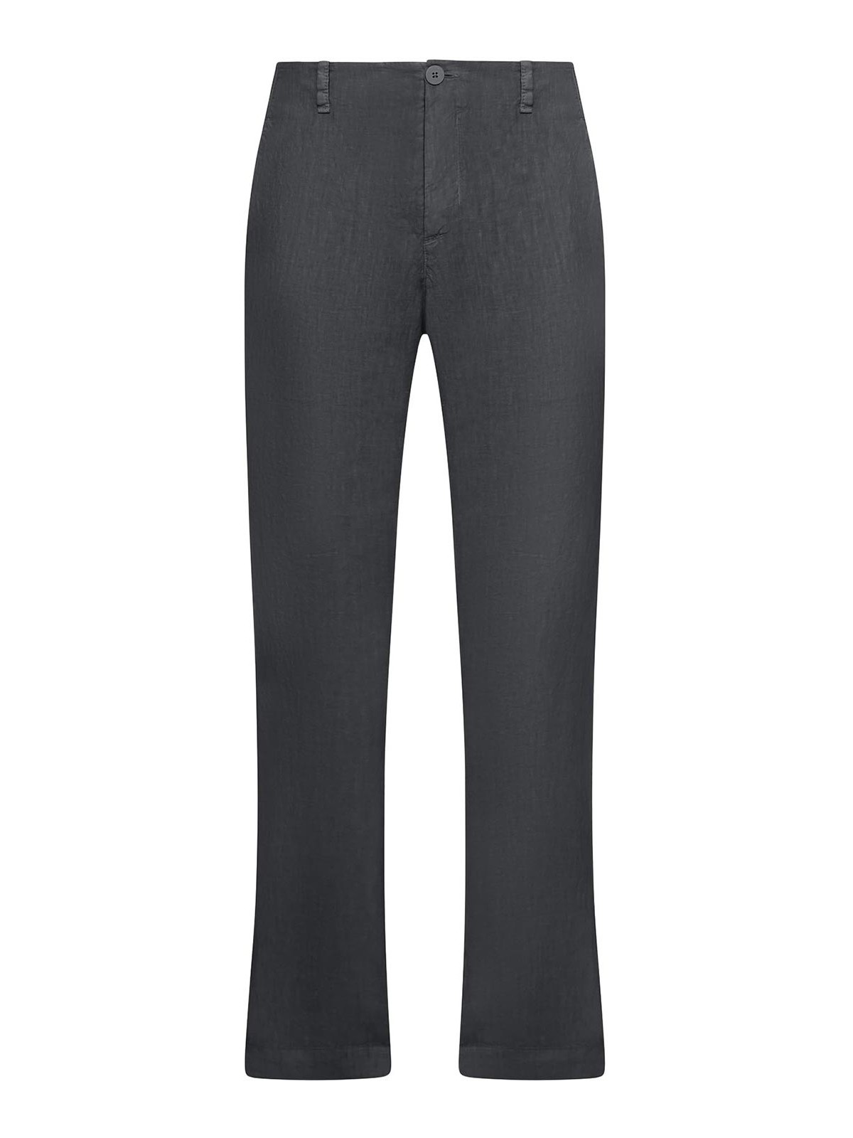 linen canvas, belt loops, front button closure, cotton buttons, front hip pockets, back yoke pockets, regular fit, garment dyed, color: charcoal