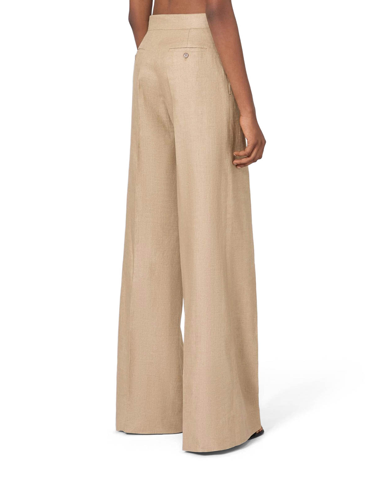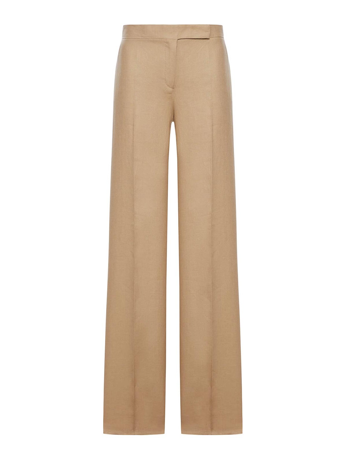 straight leg, slightly open at the bottom, regular fit, made of pure linen, high waistband with zip fly and hook closure, inset hip pockets, horizontal welt pockets with button on the back, ironed crease on the leg, stitched darts at the waist on the back, the model wears a size 40 (it) and is 178 cm tall, color: sand