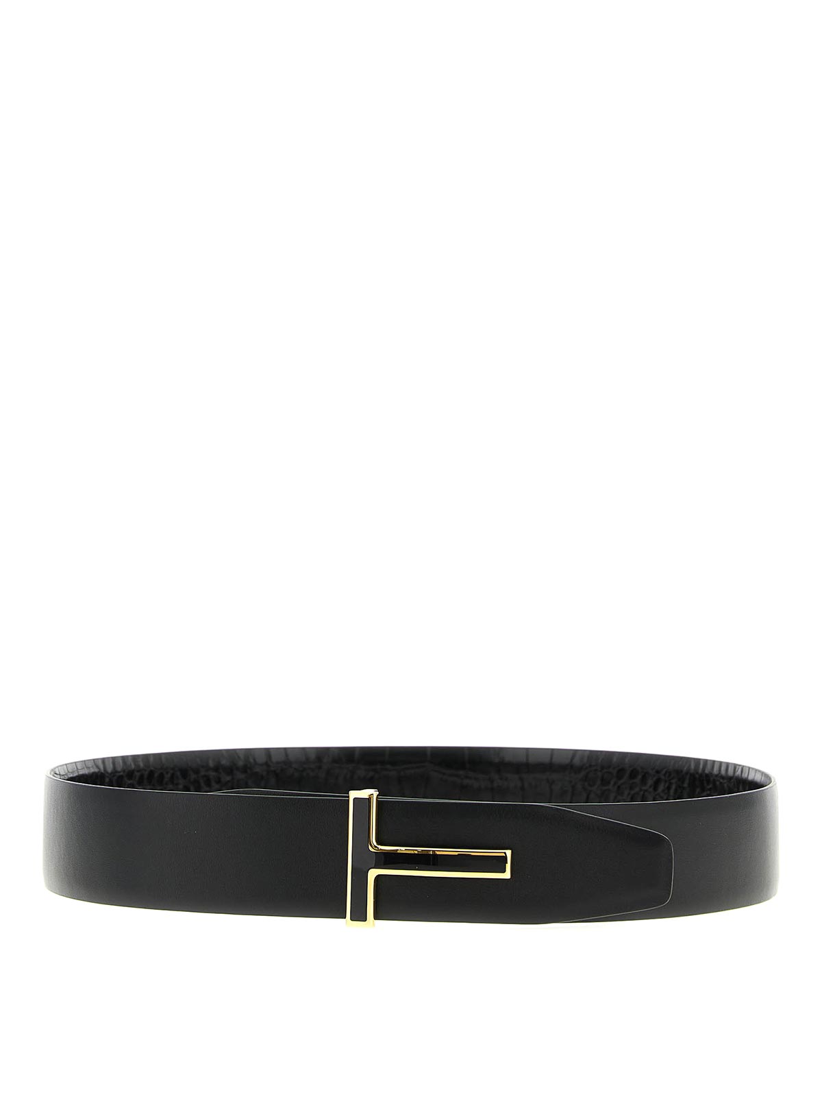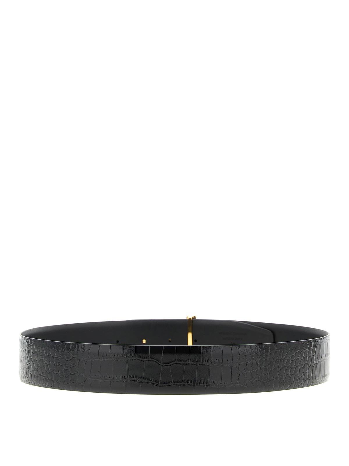 Reversible belt in shiny crocodile-effect leather and smooth matte leather, with enameled metal logo buckle. side a: shiny crocodile-effect leather side b: smooth matte leather