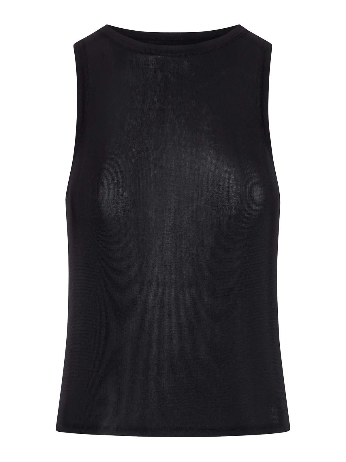crew neck, sleeveless, semi-sheer design, ribbed knit, finished straight hem, slim fit, color: black