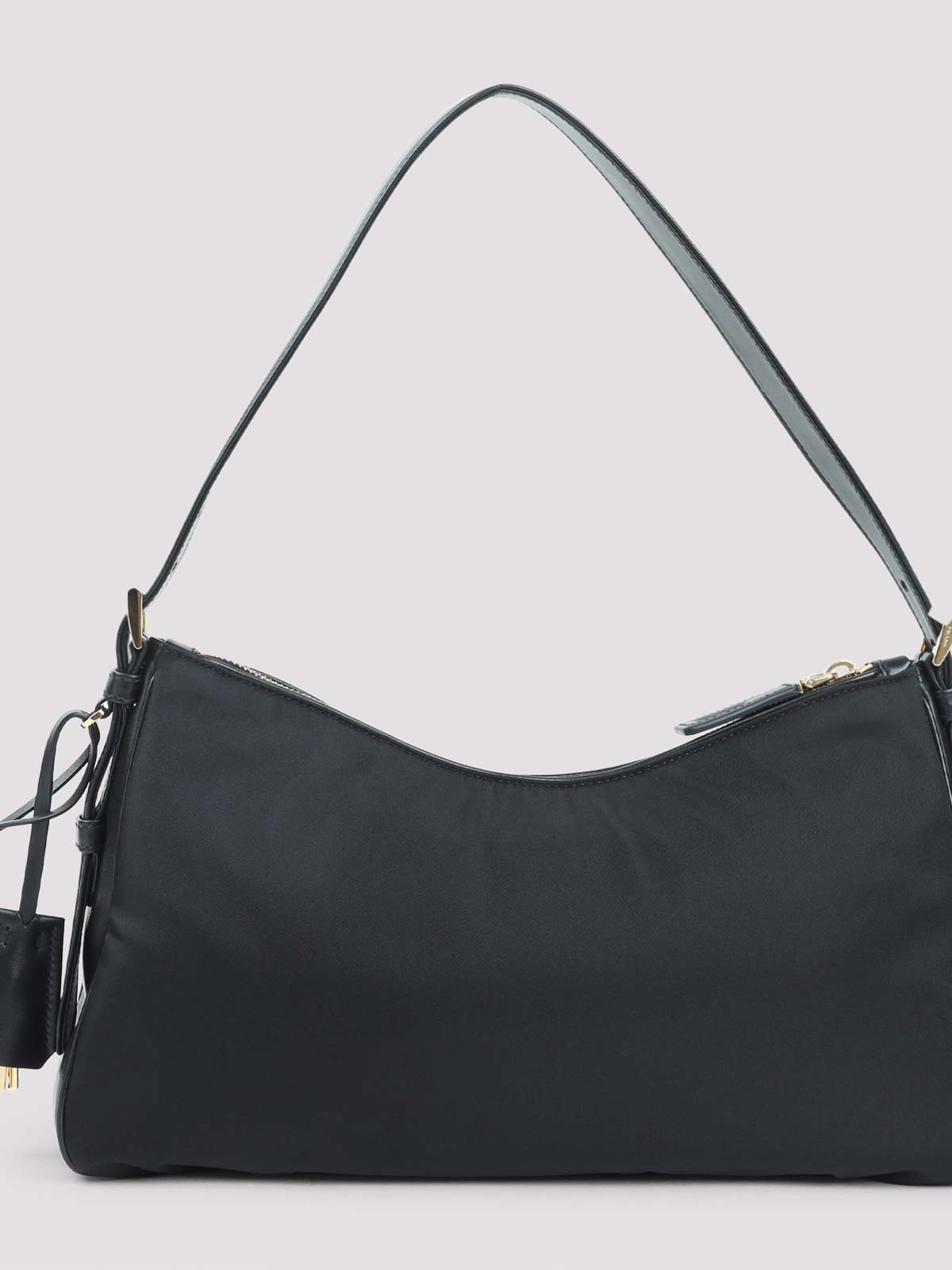 Prada black recycled polyamide sacca handbag. pure black recycled polyamide handbag, top adjustable shoulder strap, top zipped fastening, front signature triangle logo, front gold-tone metallic logoed lock with black detail, side tonal tag, one main compartment, tonal stitching. gold-tone hardware.