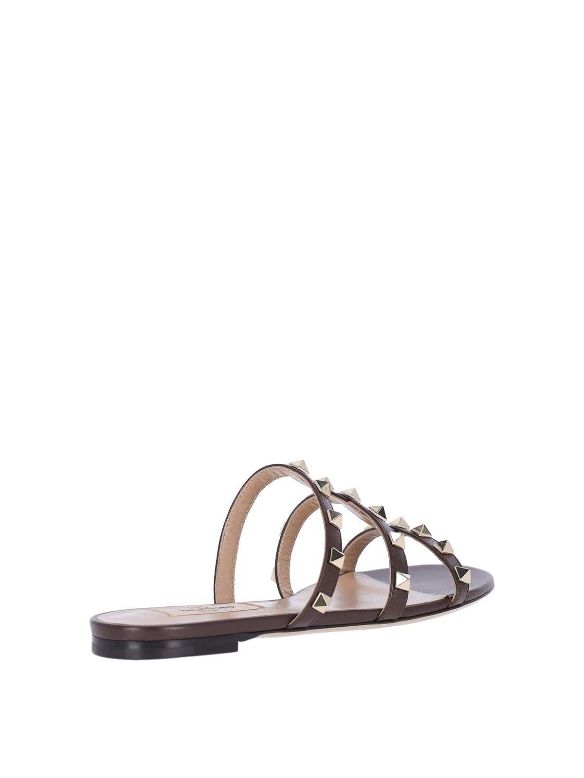 Valentino Garavan rockstud sandals in brown calfskin, open round toe, upper bands, all-over rockstud metal stud details, slip-on fit, leather sole.