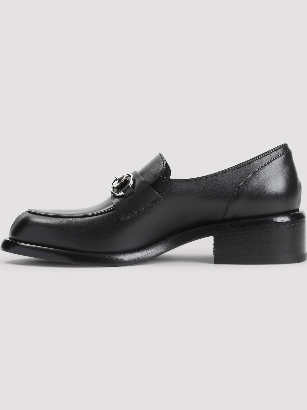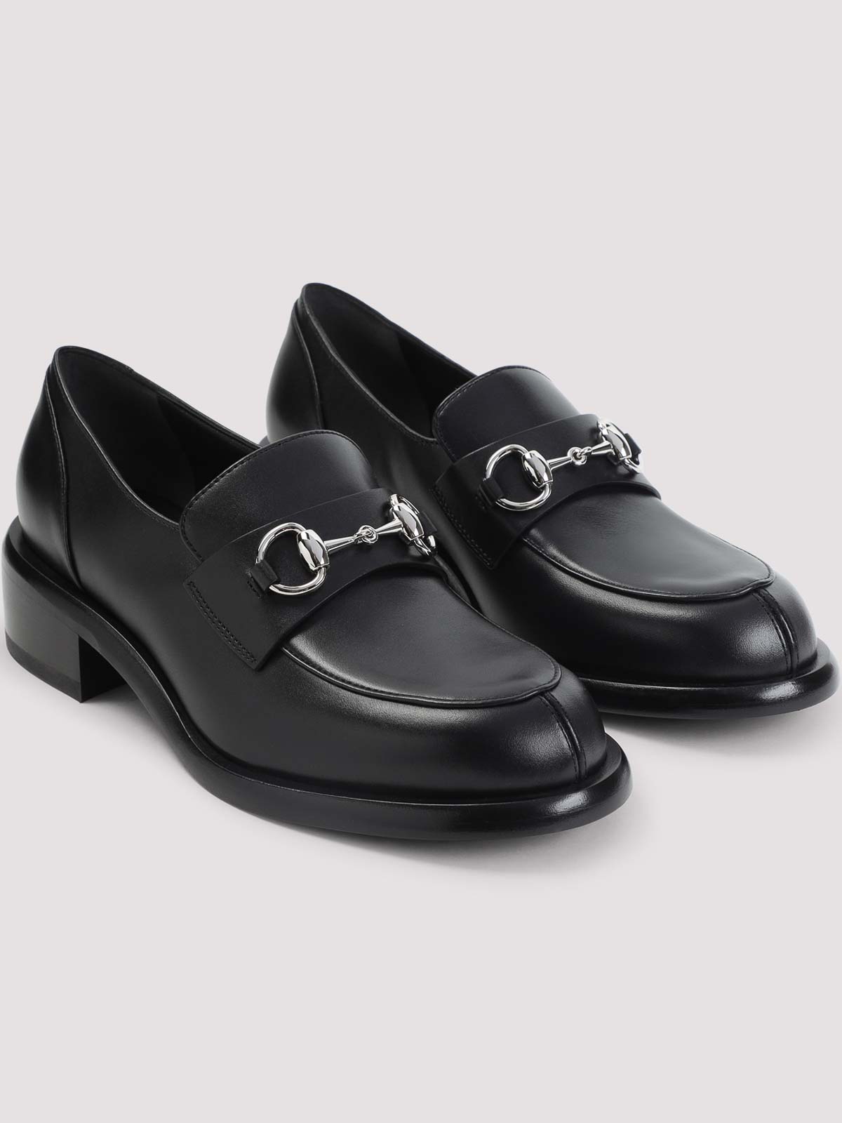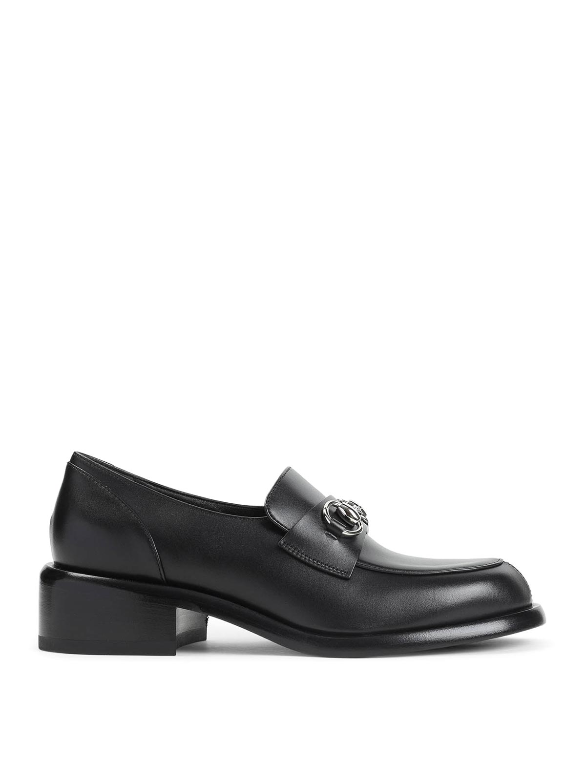 Gucci savoy black leather loafers. crafted from black calf leather, featuring a round toe, a silver-toned horsebit detail, a reinforced heel, a block heel, and a leather insole and outsole.