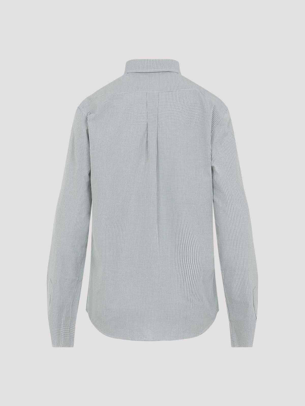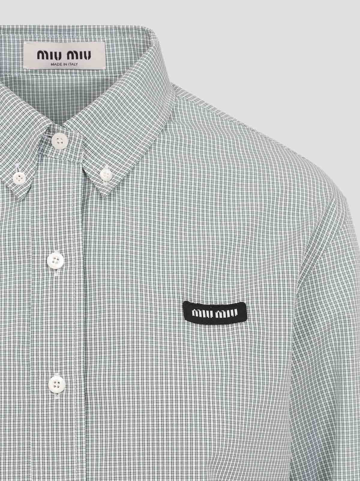 Miu miu emerald green cotton shirt. pure emerald green cotton shirt, pointed buttoned collar, front buttoned fastening, chest patch logo, dropped shoulders, long sleeves, buttoned cuffs, round hem. white and emerald green checked pattern all-over.