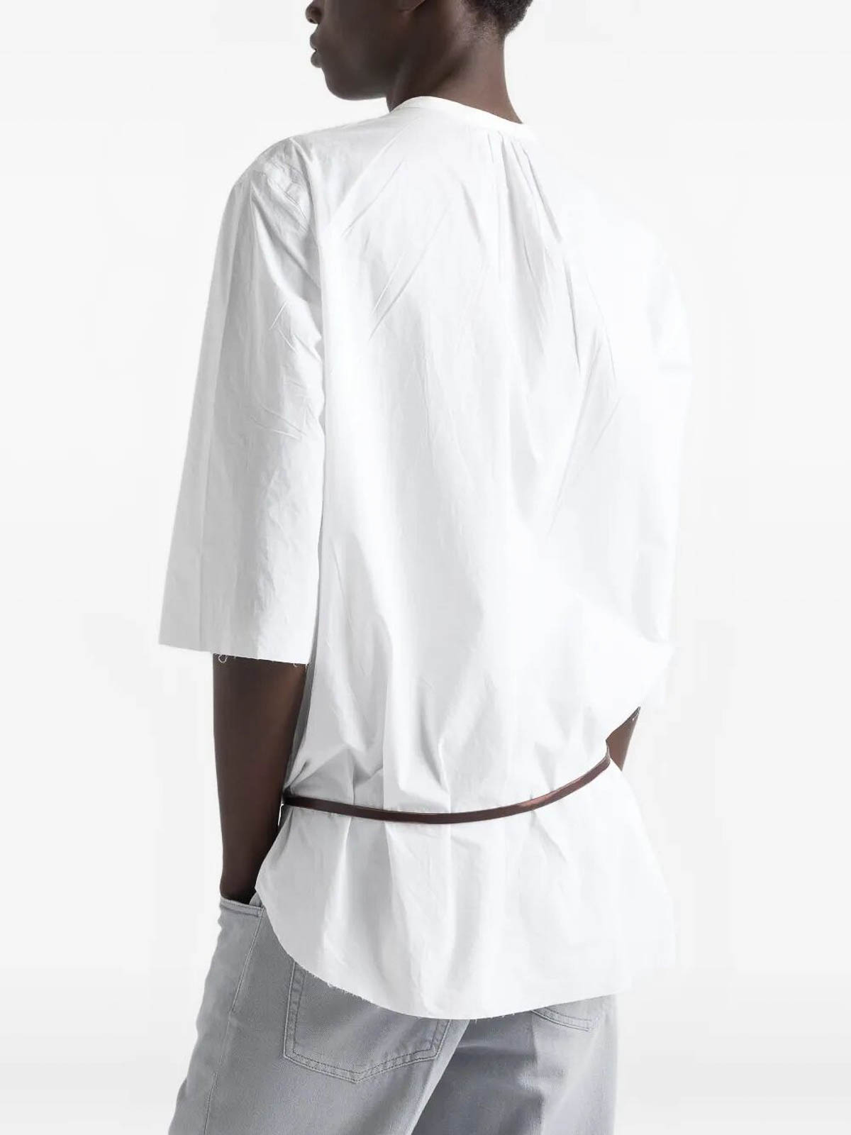 A wide silhouette, in a cotton with an impalpable feel, characterizes this shirt with details that give voice to a timeless beauty, and at the same time naturally instinctive, modern, the folds that create movement and depth, and the cuts on the hem of the sleeves and on the bottom, tell of a renewed elegance, loose fit, mandarin collar, front with box pleat, rounded bottom, opening with mother-of-pearl buttons, shirt characterized by a raw cut on the bottom hem and sleeves