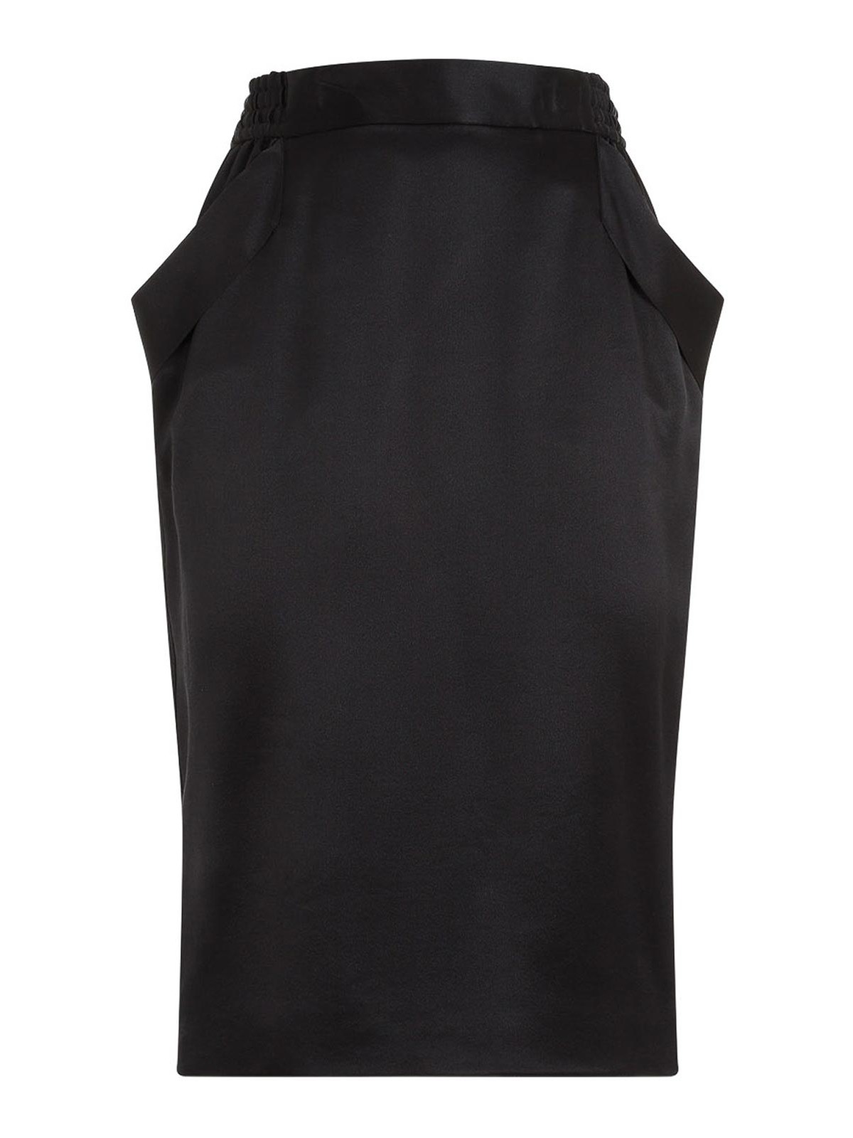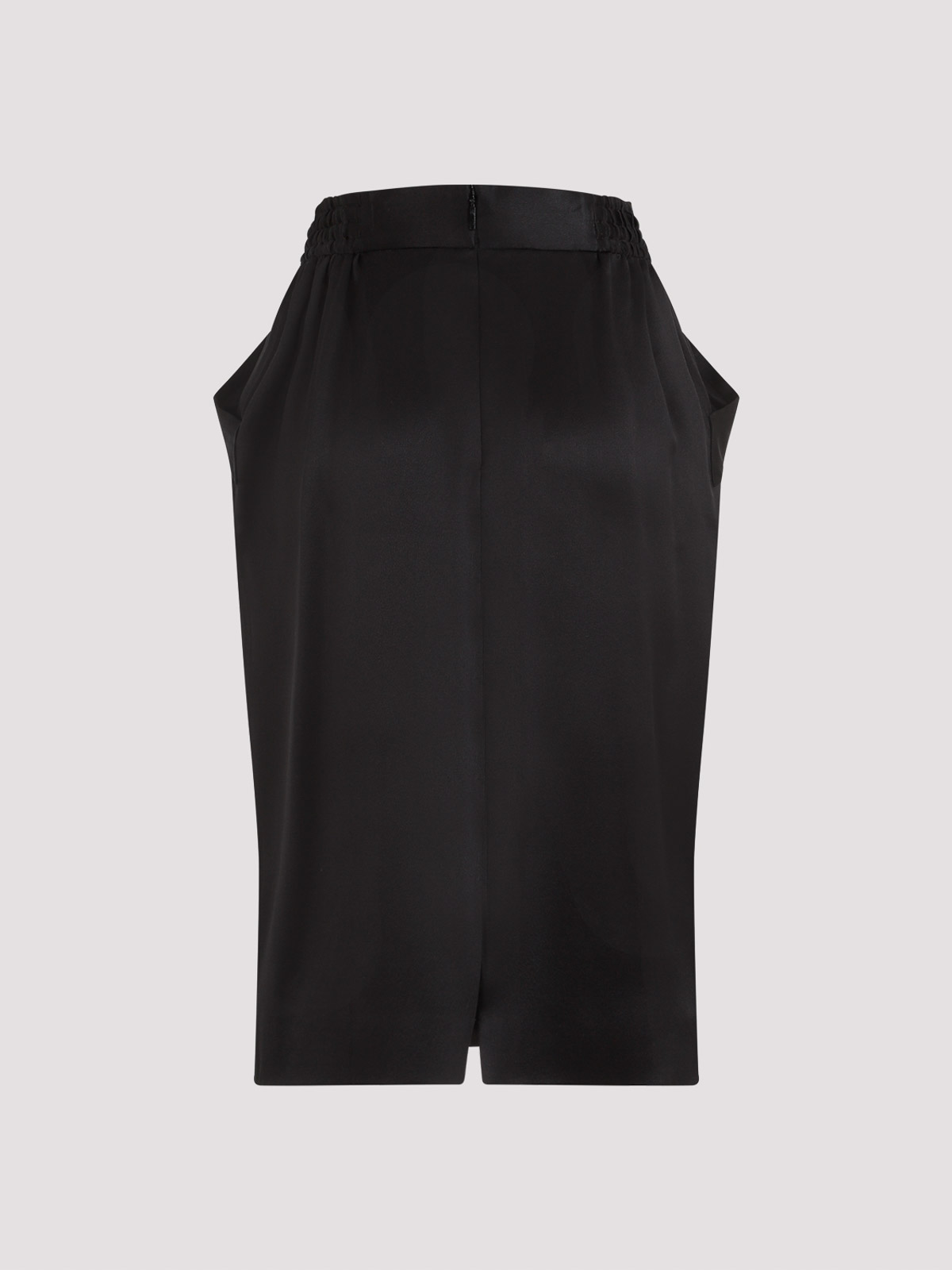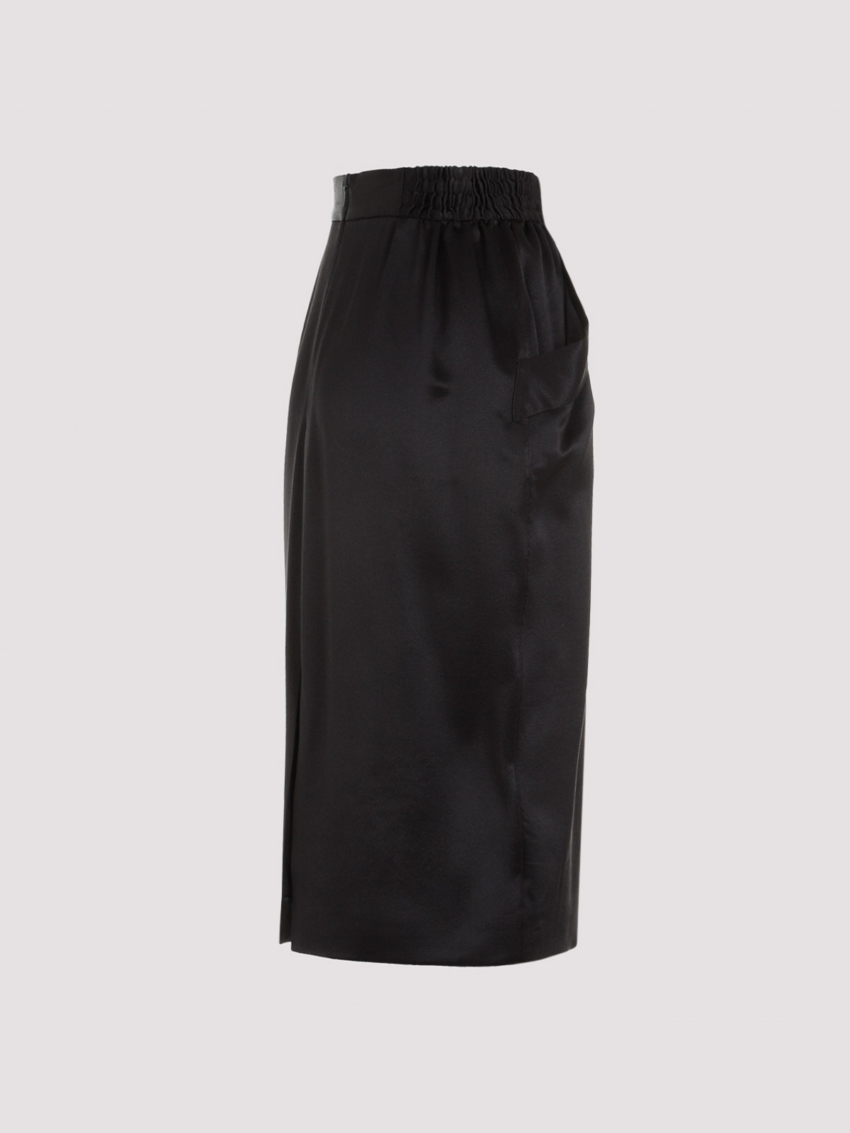 Saint laurent black silk midi skirt. black silk satin crpe, elasticated waistband, side welted slash pockets, back concealed zip closure and back central vent, silk lining.